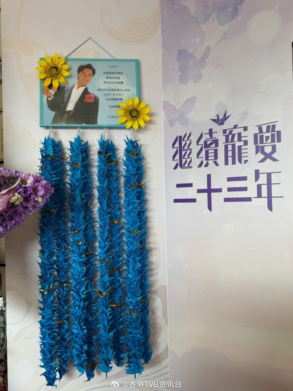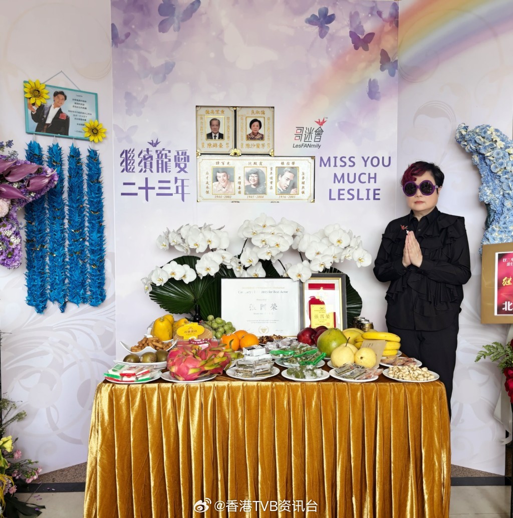 各地荣迷送心意各地荣迷今年亦一如以往,纷纷送上心意,现场化为一片花海。长情的日本荣迷,一如以往每个纪念日,亲手折叠千羽鹤带来香港送给“哥哥”;韩国荣迷则把“哥哥”于2025年第一届仁川国际民俗电影节,凭《霸王别姬》荣获最佳男主角奖的奖牌,带来献予“哥哥”,并转交由陈太代为保存。该届仁川国际民俗电影节于去年6月在韩国仁川举行,主办单位当时特别邀请韩国荣迷代表上台代领奖项。