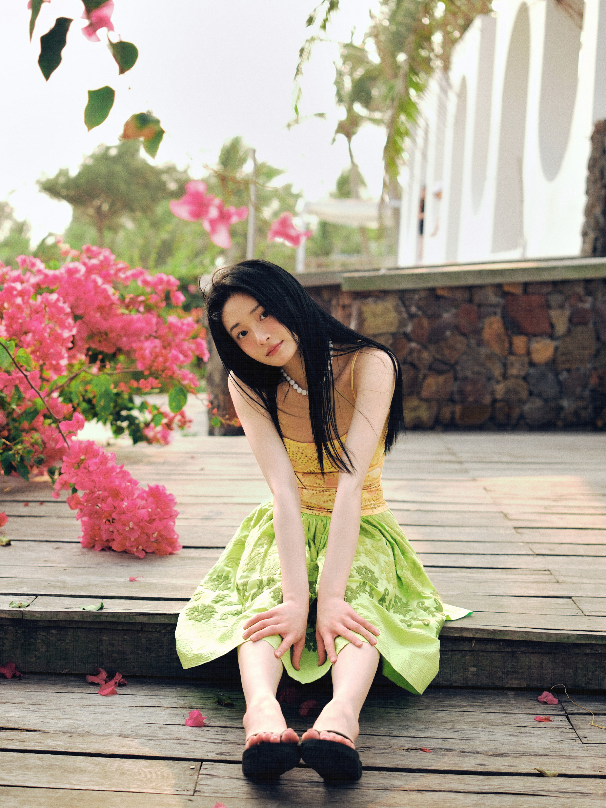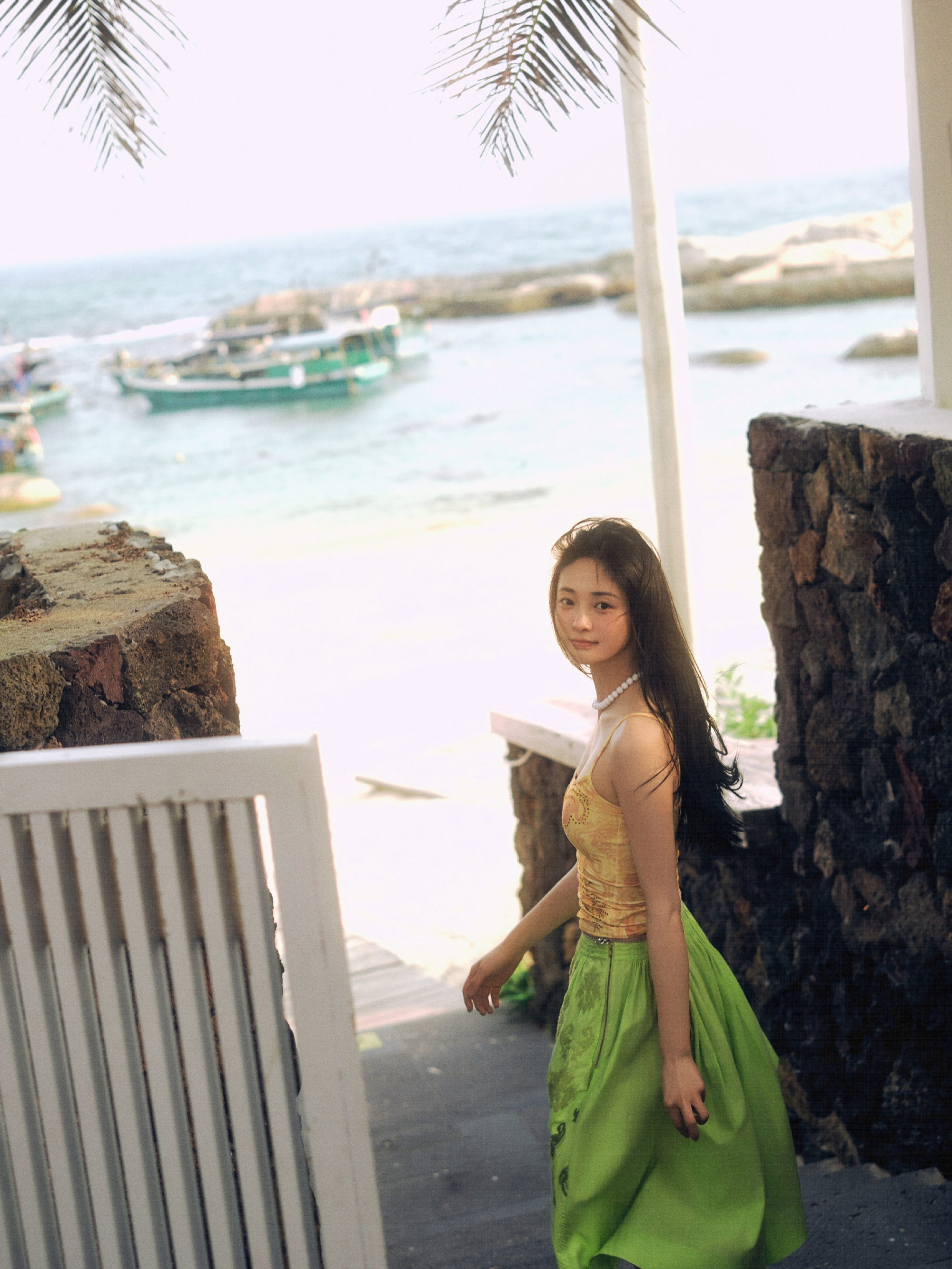 这周洁样子这组写真美到失语椰风海韵作背景,黄吊带配绿半裙,黑长直被风吹起,慵懒又