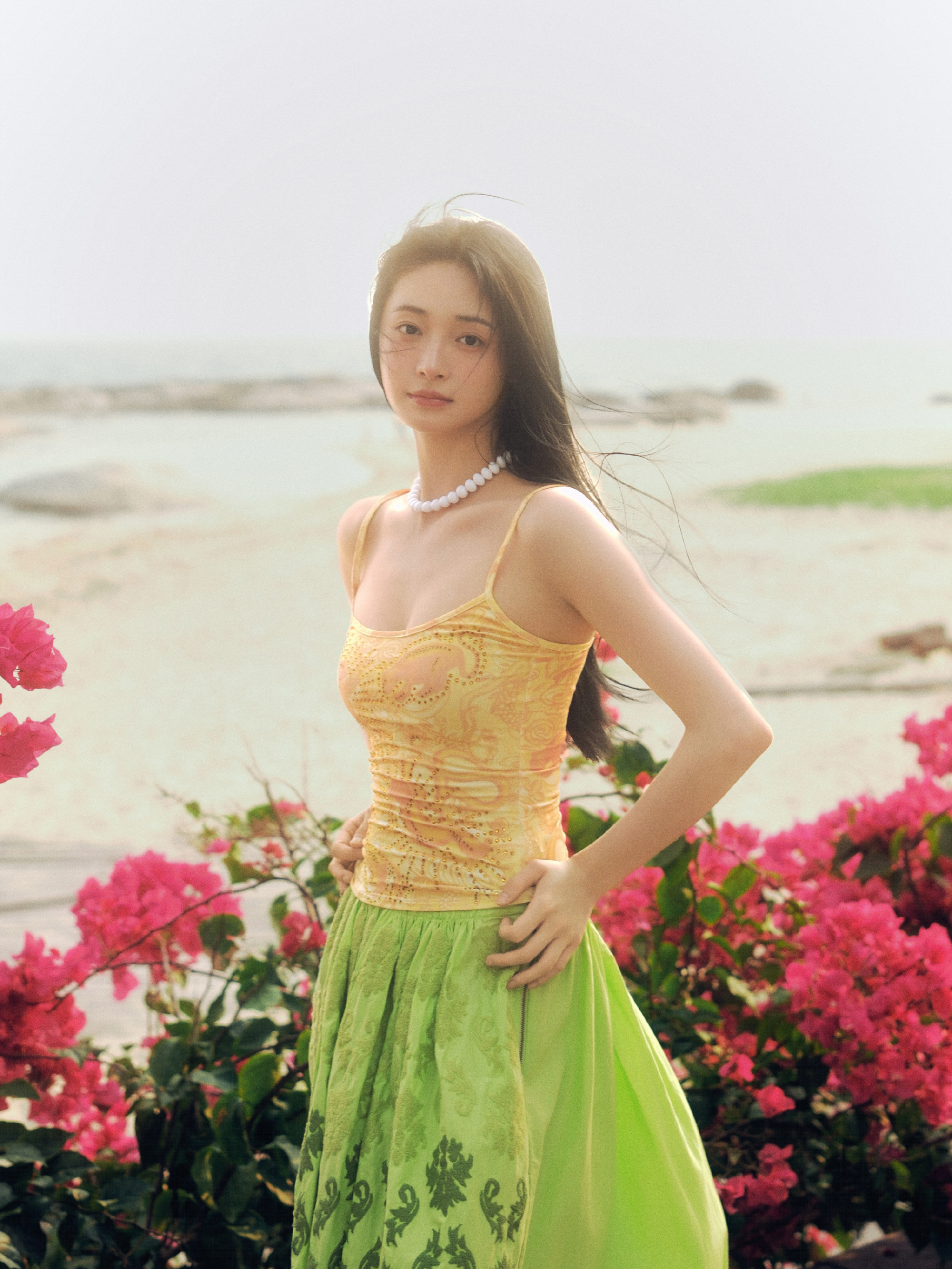 这周洁样子这组写真美到失语椰风海韵作背景,黄吊带配绿半裙,黑长直被风吹起,慵懒又明媚已经感受到浓浓的夏天气息啦
