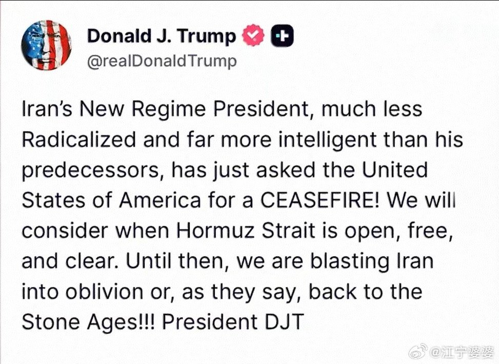 川皇今早起床第一条:【伊朗新任话事人是个明白人,他向我请求停火啦!】