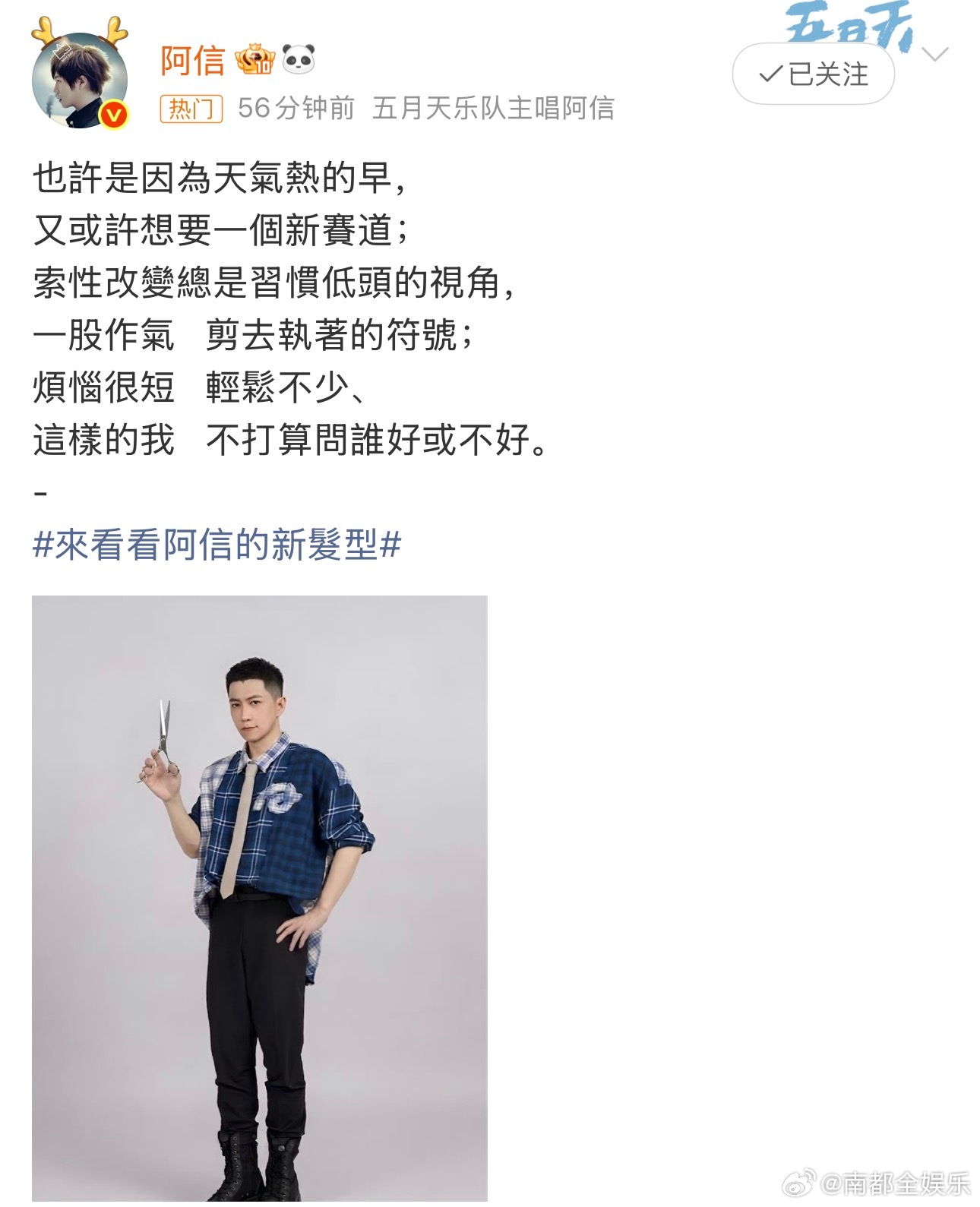 阿信寸头今晚,阿信晒出“寸头新发型”,并配文:“也许是因为天气热得早,又或许想要一个新赛道;索性改变总是习惯低头的视角,一股作气 剪去执着的符号;烦恼很短 轻松不少、这样的我,不打算问谁好或不好。”粉丝纷纷留言:“答应我,老人家不许这样玩AI了”!梦回11年前,阿信也在愚人节说过“下定决心换了全新的造型”,你真是对新发型乐此不彼啊!