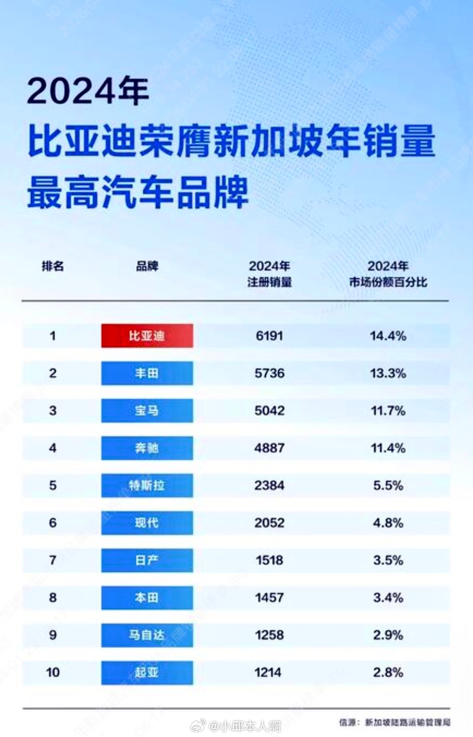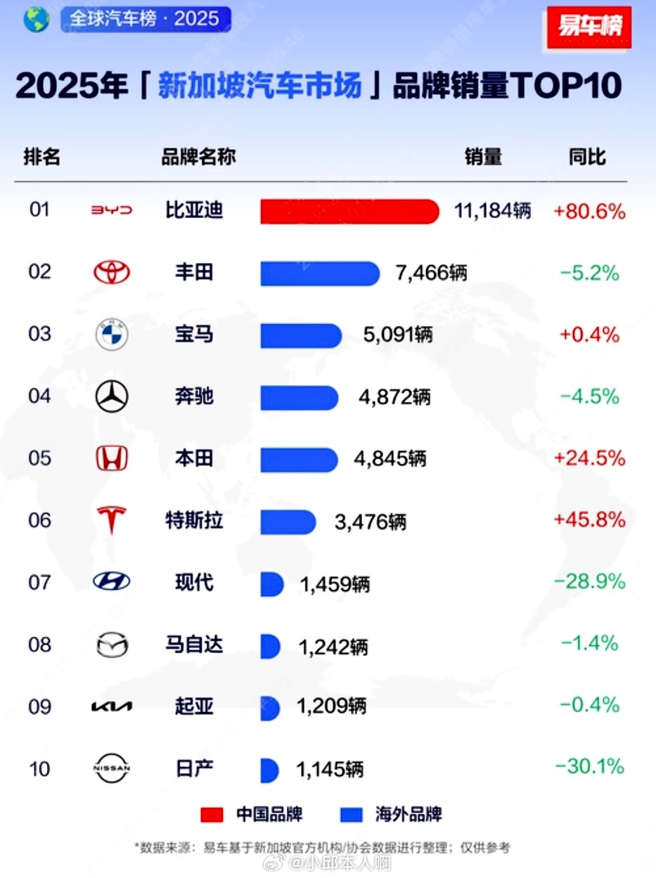家用车方面,比亚迪2022年才进入新加坡市场,之后销量和排名一直在涨。2023年卖了1416辆,排第五,2024年升到第二,2025年卖了11184辆,增长80.6%,市场份额21.2%,拿到销量第一,也是新加坡第一个一年卖车超过一万辆的品牌。现在比亚迪在新加坡卖ATTO 3、海豚、海豹、海狮,还有腾势D9、B5这些车型,覆盖不同价位的需求。