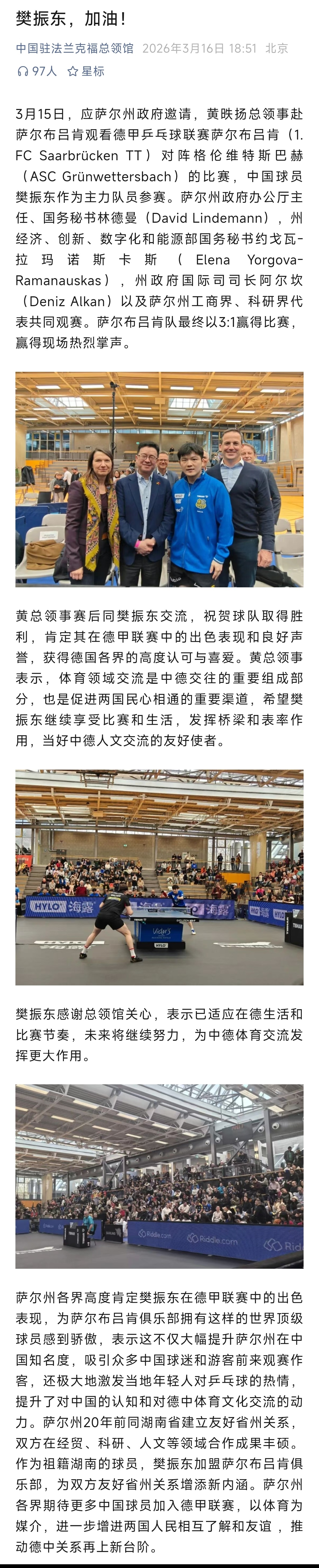 樊振东这个弱点太明显了吧!德甲20轮打完,萨尔布吕肯经理陪东哥一起走出赛场