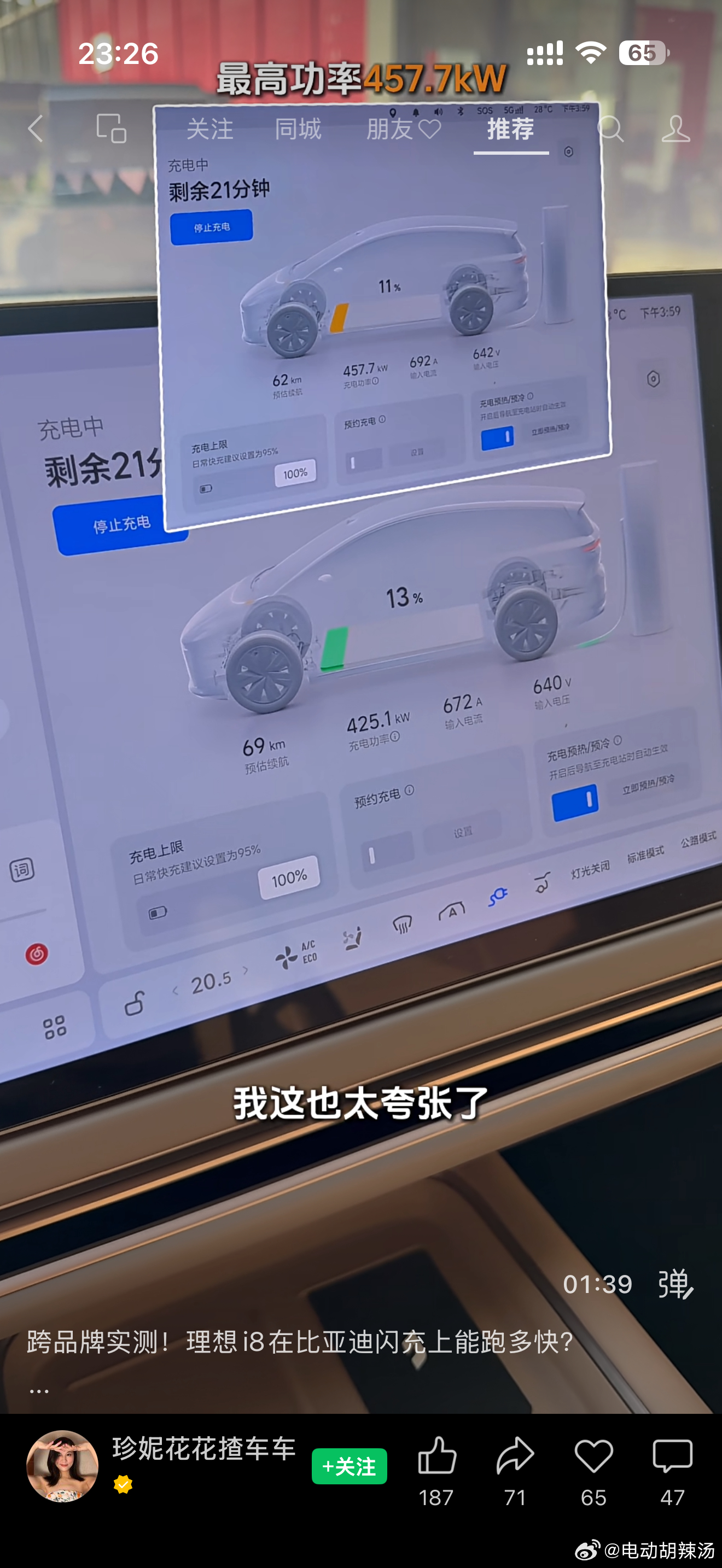 刷视频号看到一个车主开理想i8 去比亚迪闪充充电,峰值功率440+kW,最终7%-97%用时18分钟,这速度基本上和理想5C满功率没差异了!