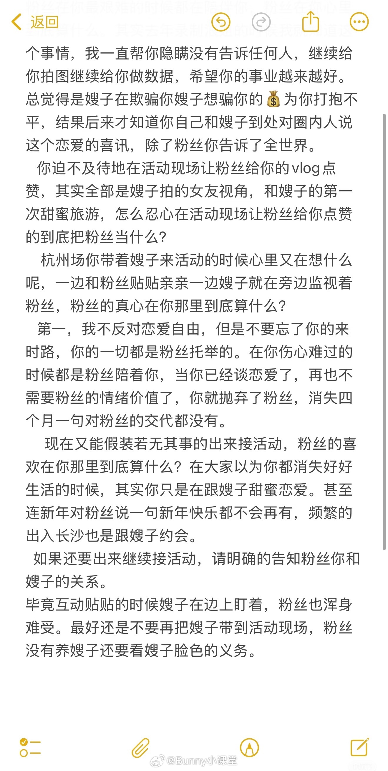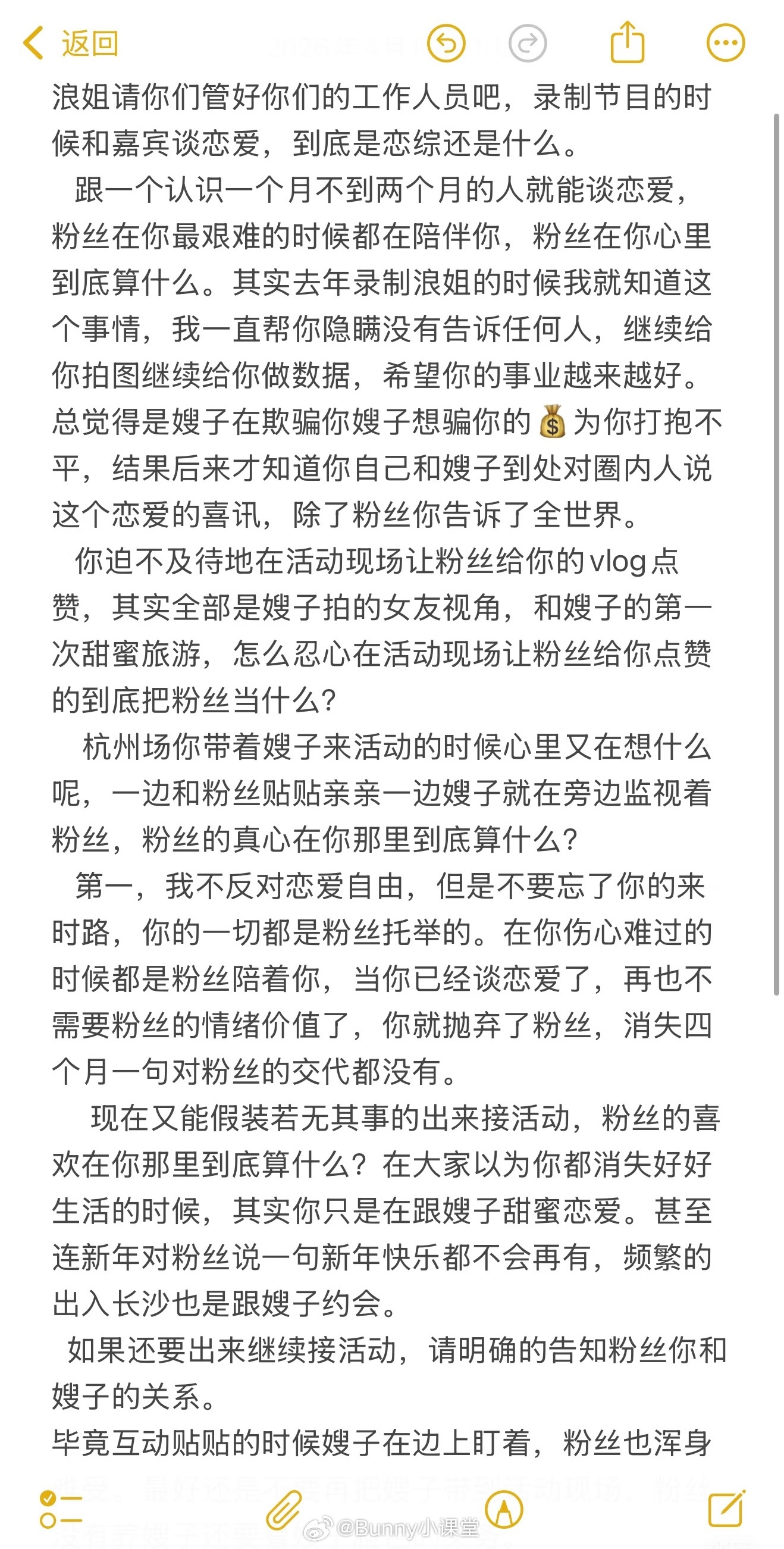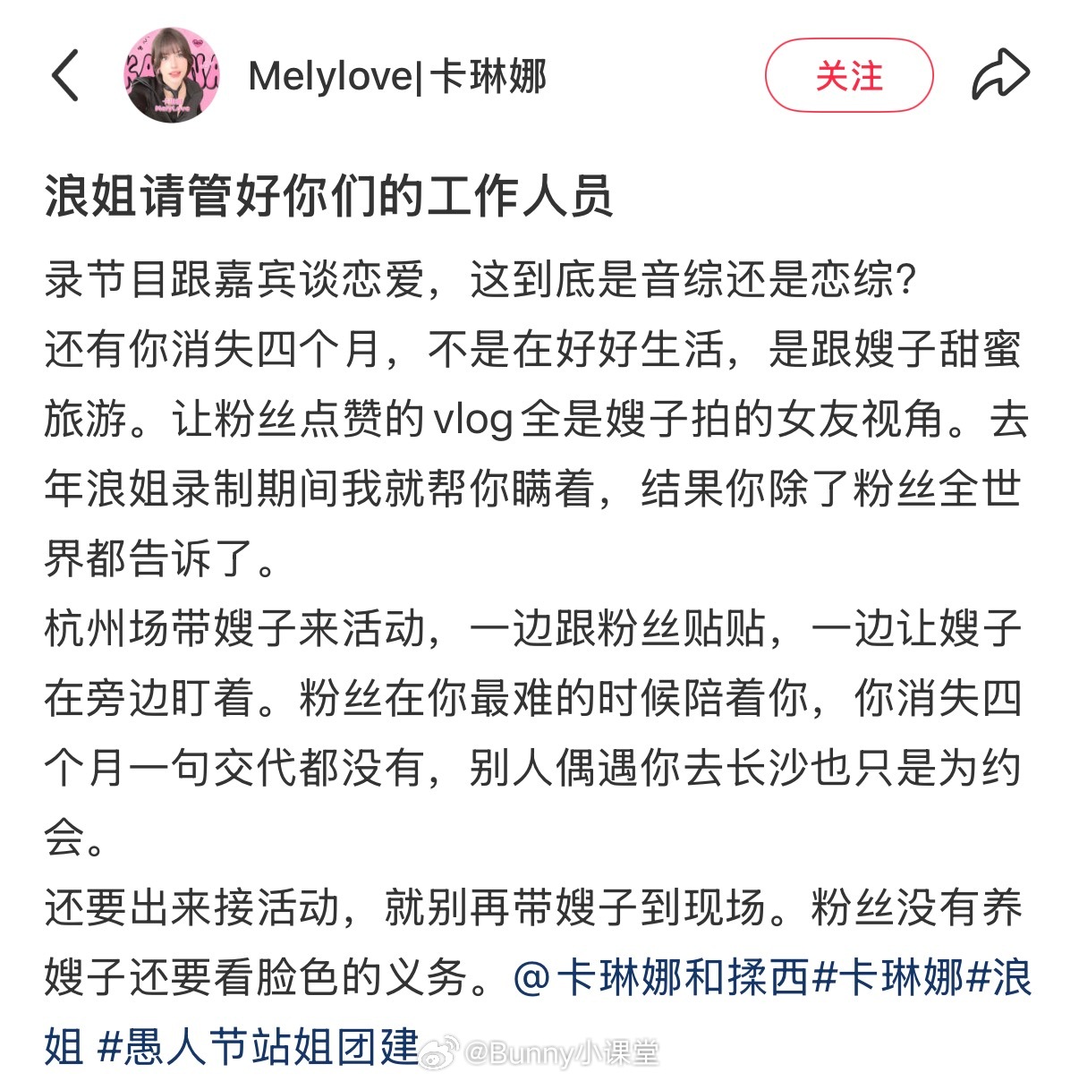 卡琳娜站姐喊话浪姐节目组管好工作人员,说录制节目的时候和嘉宾卡琳娜谈恋爱!该粉丝还称去年就知道这个事情,但一直帮忙隐瞒到现在,结果卡琳娜主动和圈内人透露恋爱消息,唯独瞒着粉丝……这是真瓜还是愚人节玩笑啊