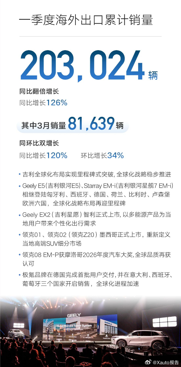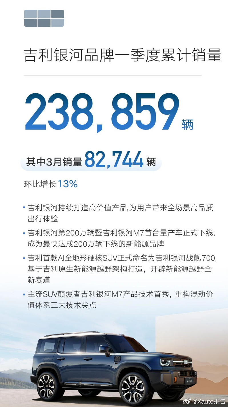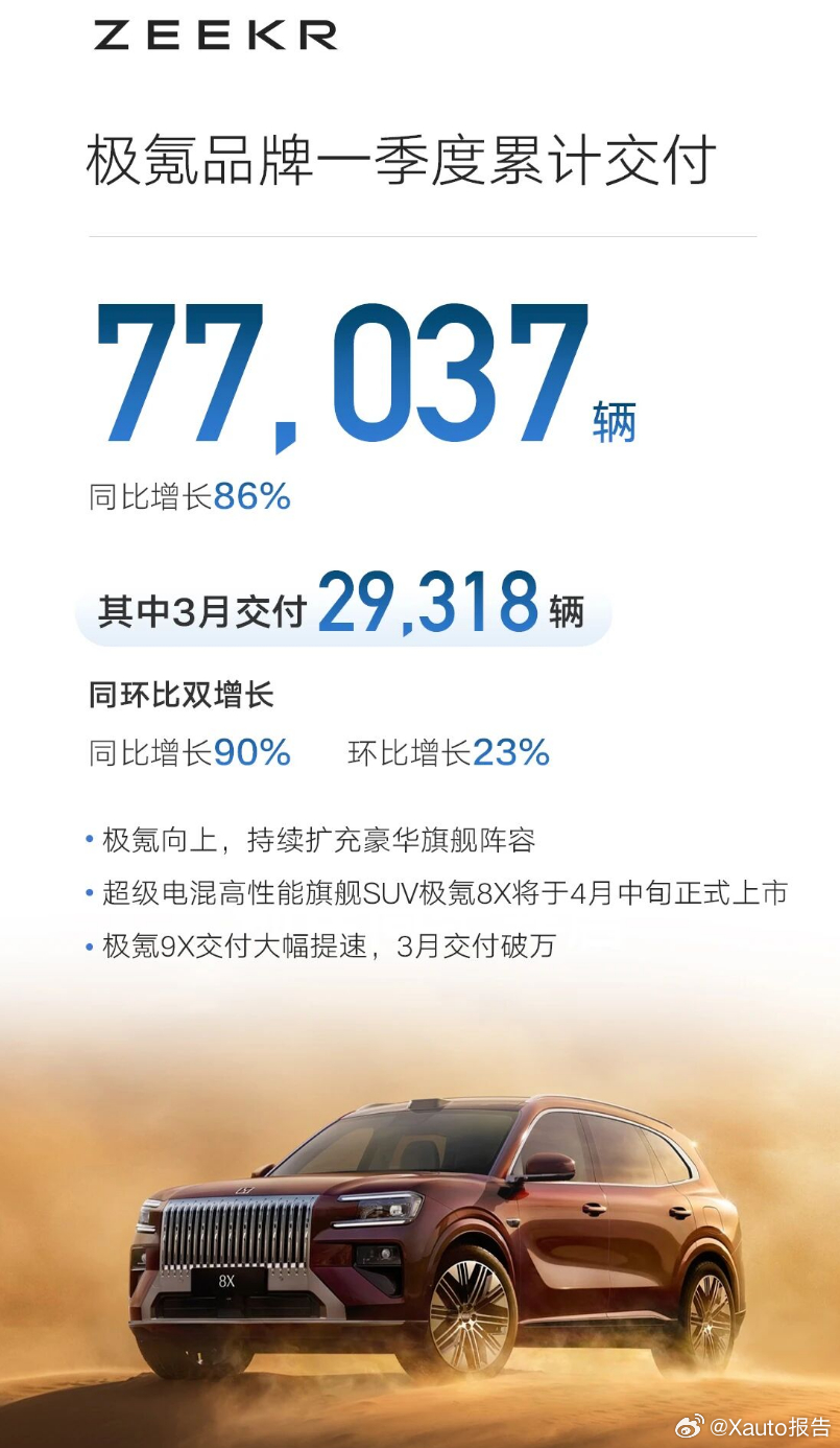 4月1日,吉利发布了3月和一季度销量业绩,3月吉利月销量为233,031辆。其中银河8.27万辆,同比跌8%;领克2.54万辆,同比增1%;极氪2.93万辆,同比增90%;新能源销量12.73万辆,同比增6%;出口销量更是创纪录,达8.16万辆,同比增长120%。