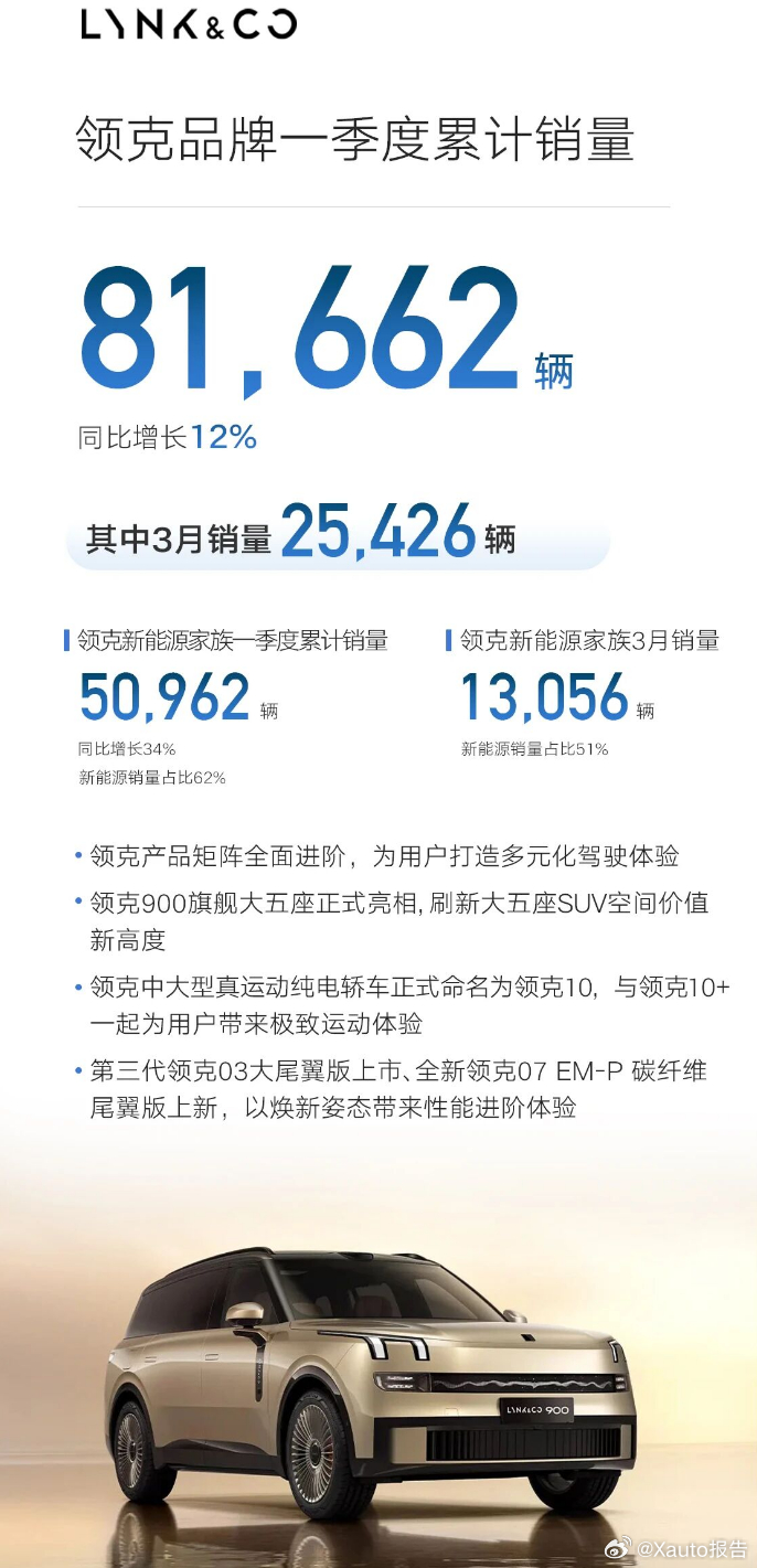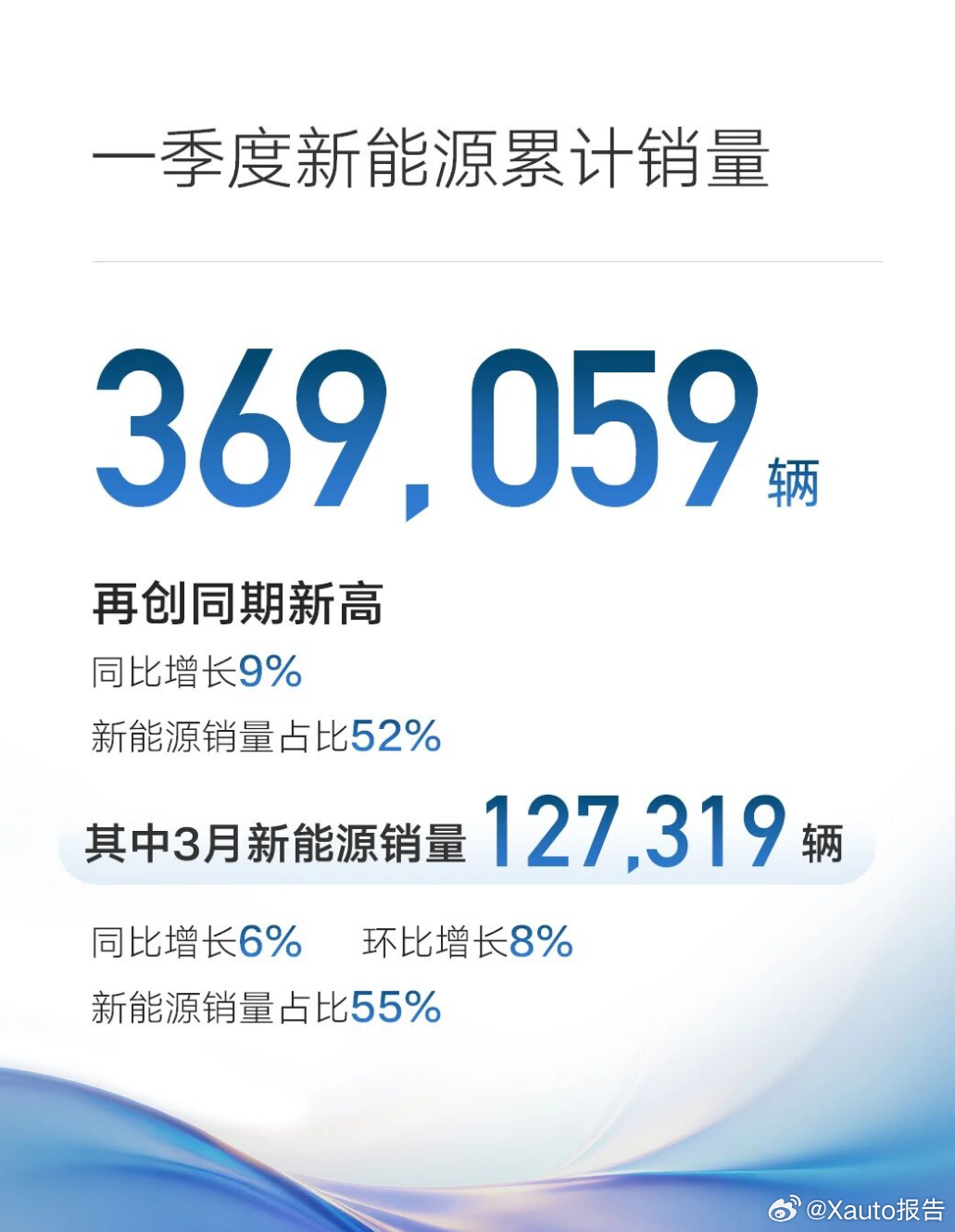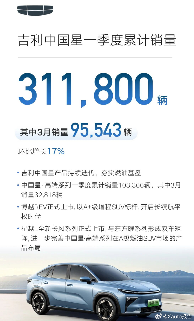 4月1日,吉利发布了3月和一季度销量业绩,3月吉利月销量为233,031辆。其中银河8.27万辆,同比跌8%;领克2.54万辆,同比增1%;极氪2.93万辆,同比增90%;新能源销量12.73万辆,同比增6%;出口销量更是创纪录,达8.16万辆,同比增长120%。
