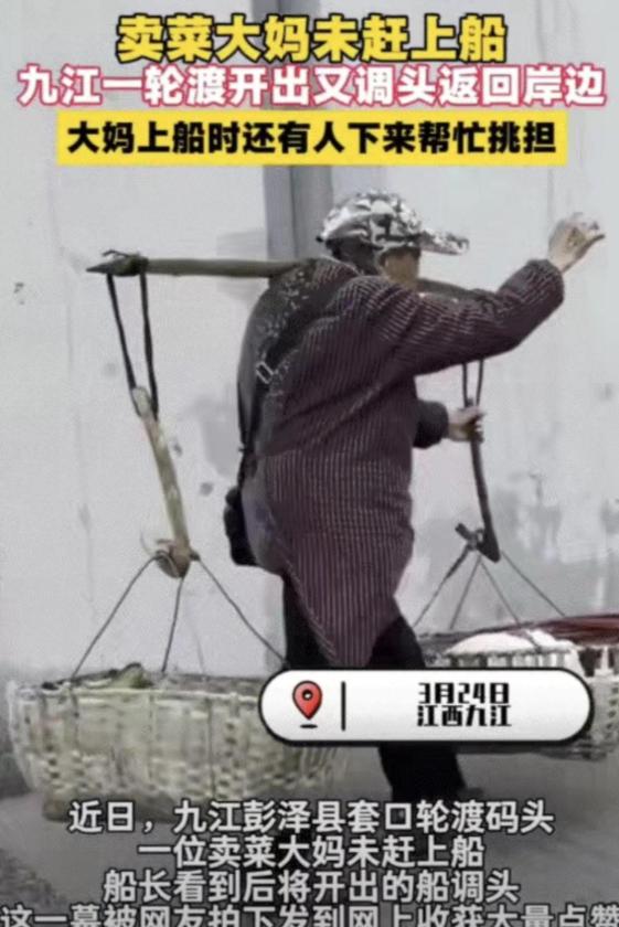 太暖心了!江西九江,八旬卖菜老人挑着担子没赶上轮渡,没想到在其焦急追赶轮渡时,都已经开出岸边的轮渡,竟又立马折返接上老人。更让人感动的是,轮渡折回后,船长亲自下船帮老人挑起担子,另一人也上前帮忙搀扶老人上船。 事情发生在江西九江的一个普通渡口,那天天气不算好,还刮着寒风、下着冷雨,江面上雾蒙蒙的。一位八旬老人,挑着一担足足大几十斤重的青菜,急匆匆地赶往渡口,想着坐轮渡进城,把这些青菜卖掉,换点零花钱,可还是来晚了一步,等他赶到岸边的时候,轮渡已经离岸几十米远了,正朝着江对面驶去。 老人看着渐渐远去的轮渡,急得团团转,手里紧紧攥着扁担,眼神里满是绝望和无助,他挑着这么重的担子,冒着寒风冷雨赶过来,就是想赶上这一班轮渡,要是错过了,下一班还得等两个小时, 这么冷的天他一把年纪,根本经不起长时间的等待,而且这一担青菜,要是耽误了时间,卖不出去辛苦就白费了。 情急之下老人只能挑着担子,沿着岸边拼命追赶脚步蹒跚,每走一步都显得格外吃力,那佝偻的身影,在寒风冷雨里,看着就让人心疼,他心里抱着一丝希望,盼着轮渡上的人能看到他,能停下来等他一等。 让人没想到的是,奇迹真的发生了,已经开出几十米远的轮渡,突然在江面上画出一道突兀的弧线,没有继续向前行驶,反而伴着沉闷的马达声,径直掉头朝着老人所在的渡口重新靠岸,那一刻老人悬着的心,终于放了下来眼里也泛起了光亮。 轮渡刚一停稳,船长就迫不及待地一个箭步跳下甲板,大步朝着岸边的老人跑过去,没有丝毫犹豫,一把接过老人肩上压得弯弯的扁担,扛在了自己肩上。那担青菜沉甸甸的,船长扛着也有些吃力,可他没有半点怨言,只想赶紧帮老人减轻负担。 更让人感动的是,船上的乘客们,看着船长折返接老人,没有一个人抱怨,没有一个人催促,平时可能会因为抢座位红脸的人们,此刻却出奇地包容,安安静静地看着这一切,没有人觉得耽误了自己的时间。 老人摇摇晃晃地走到轮渡的跳板边上脚步不稳,就在这时船上一位素不相识的乘客,立马站起身,伸出双手,快步走上前,连扶带拽地把老人稳稳当当地搀扶进船舱,生怕老人不小心摔倒,整个过程,没有多余的话语,只有默契的配合,那份善意,真实得让人心里发烫。 后来大家才知道,这位船长已经在这个渡口守了整整十年,每天来往的,大多是两岸挑菜进城叫卖的老人,一来二去,船长和这些老人早就处成了乡亲,不是亲人却胜似亲人。 他太清楚这些老人的不容易,一把青菜卖不了几个钱,却承载着他们谋生的希望,所以他才会毫不犹豫地掉头,宁愿耽误一船人的时间,宁愿多耗点油,也要接上这位老人。 而且这么多年,船长一直都在默默照顾这些卖菜的老人,去的时候只象征性地收一点单程路费,等他们卖完菜空着担子回来,就直接免了他们的船票,看似做着“亏本生意”,可他却从来没有计较过。 这件事传到网上后,很多网友都被暖到了,大家纷纷说,太暖心了,在这个讲究效率、追求利益的时代,这样的善意太难得的,船长的折返,不是一次心血来潮,而是刻在骨子里的善良,乘客的相助,不是刻意的表现,而是发自内心的共情。 其实这就是最朴素的善意,没有轰轰烈烈的誓言,没有惊天动地的举动,却足以温暖人心。船长手里的方向盘,不仅接上了寒风中的老人,更护住了老人谋生的体面,一船人的包容和相助,不仅温暖了老人,也温暖了每一个看到这件事的人。 在这个有时候显得有些冷漠的社会里,这样的小事就像一束光,照亮了我们的心底,也让我们相信,善意从来都没有缺席,一句关心,一次援手,一个小小的善举,就能给别人带来大大的温暖,也能让这个世界变得更温柔。