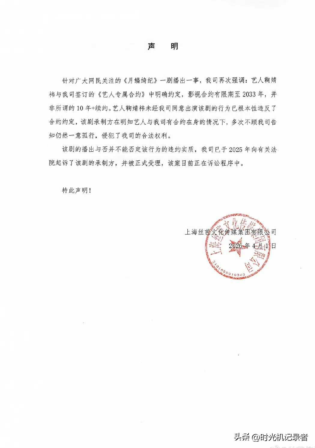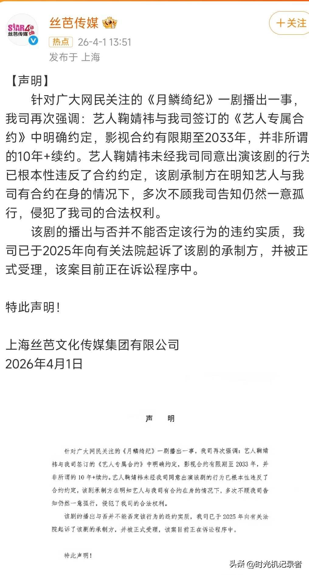 鞠婧祎到底有没有违约,丝芭发声明称已起诉月鳞绮纪承制方,剧的播出与否并不能否定该行为的违约实质。 鞠婧祎惹似芭公司不满。 大致意思是鞠婧祎和公司签订了专属合同,但是鞠婧祎自己又不经公司同意接了月鳞绮纪的剧,现在公司很生气,要对鞠婧祎和月鳞绮纪承制方追责。 如今很多艺人和公司有意见不和,都是最开始不出名时候签订的协议,一旦艺人有了其他想法,签署公司又无法提供太多资源,就会出站矛盾。
