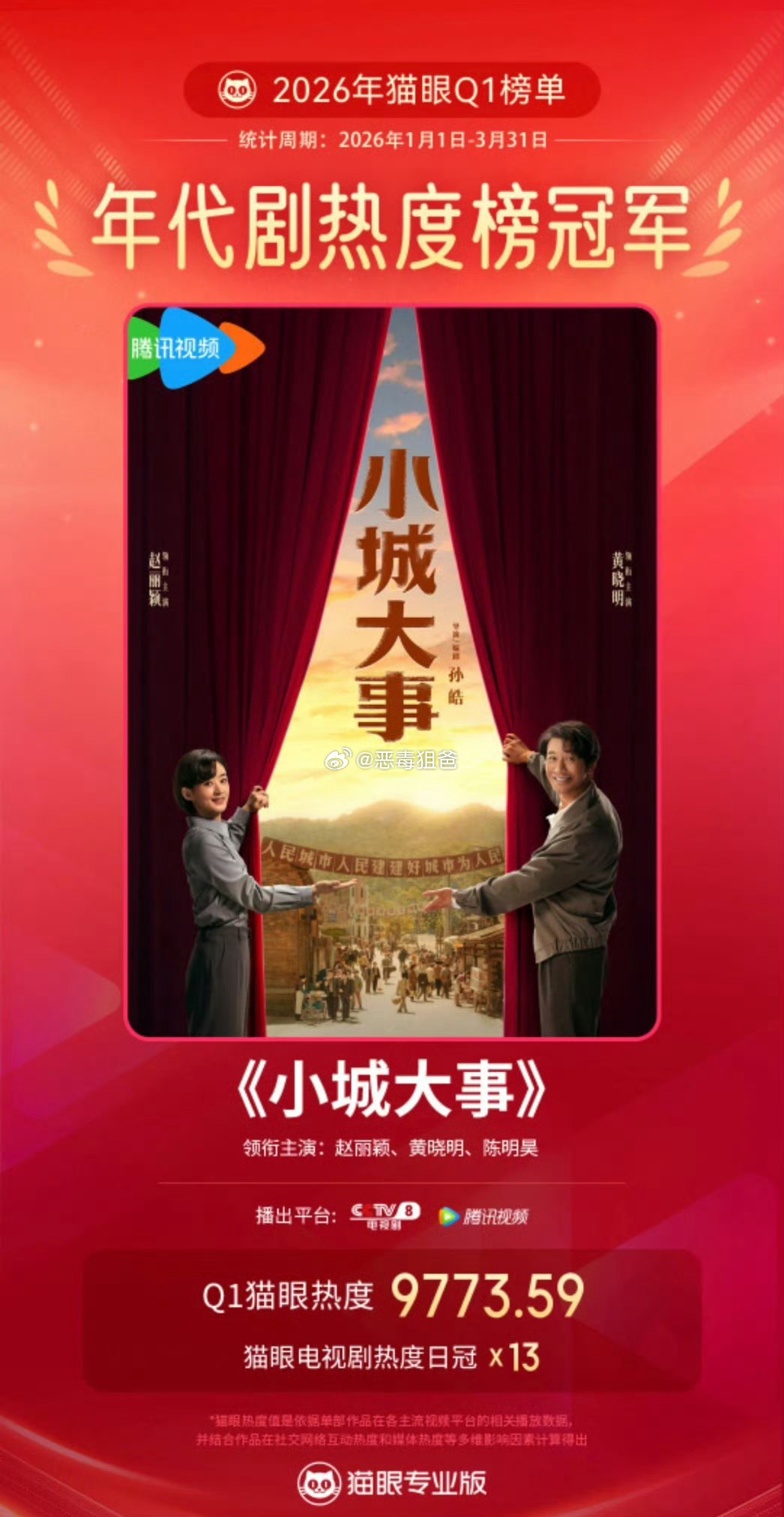 恭喜小城大事获得灯塔第一季度年代剧播放量TOP1,同时也获得猫眼第一季度年代剧冠军☝🏻。