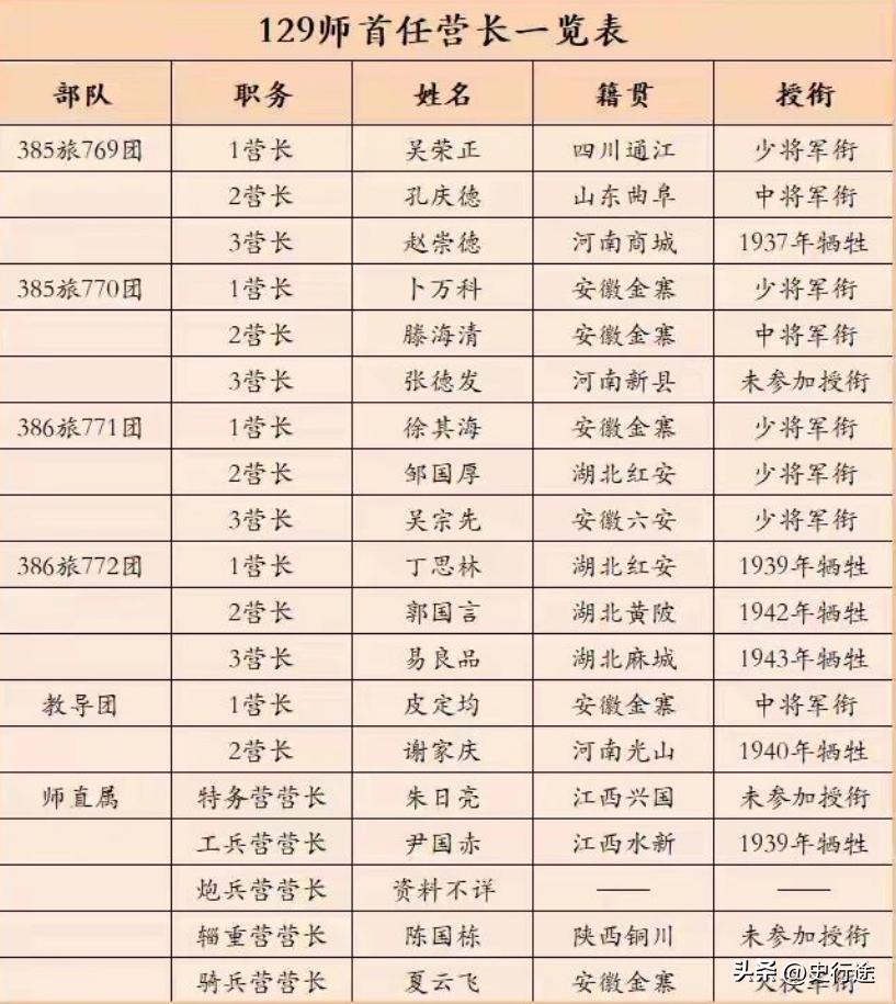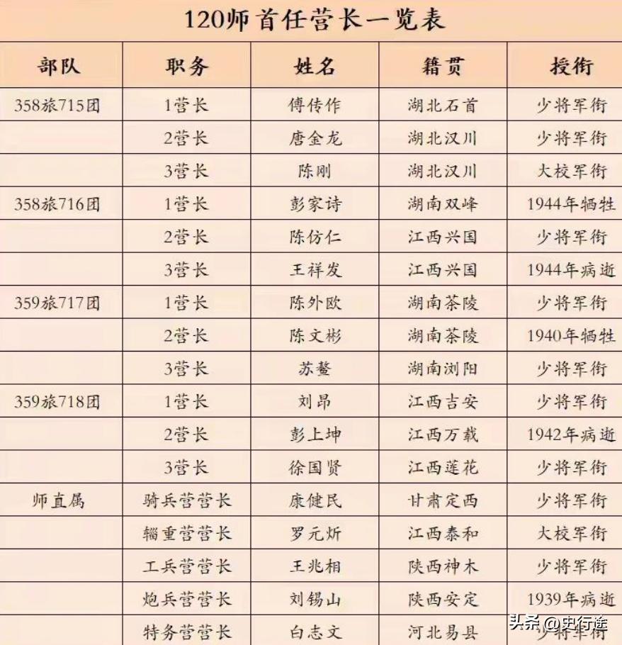八路军的营长能授予什么军衔? 如图:营长们授予的最高级别军衔是中将,其中115师和129师分别有3人被授予了中将军衔。 一九五五年授衔,最容易让人犯迷糊的地方,不是元帅、大将那些高位,偏偏是营一级干部到底能走到哪一步。 很多人下意识觉得,营长再能打,顶多也就是个中层骨干,离高级将领还远着。 真把八路军的名单摊开看,才知道这想法有点想当然了。 原八路军营级干部在一九五五年授予的最高军衔,就是中将。更出人意料的是,连级干部里居然也出了中将,这事搁哪儿都算少见。 这份名单里,最扎眼的是一一五师。 人数最多,一共九位。六八五团二营营长曾国华,广东五华人,一九五二年评级正军级,后来任空军副司令员。六八五团三营营长梁兴初,江西吉安人,一九五二年评级准兵团级,后来任成都军区司令员。六八六团一营营长张仁初,湖北黄安人,一九五二年评级正军级,后来任济南军区副司令员。六八六团三营教导员刘西元,江西吉安人,一九五二年评级正军级,后来任南京军区副政委。六八八团二营教导员张天云,湖北黄安人,一九五二年评级正军级,后来任福州军区副司令员。 名单再往下看,还有三四四旅警卫营教导员李雪三,河南修武人,一九五二年评级正军级,后来任总后勤部副政委。师属骑兵营教导员蔡顺礼,江西吉安人,一九五二年评级准兵团级,后来任昆明军区副政委。师属工兵营教导员刘兴元,山东莒南人,一九五二年评级准兵团级,后来任成都军区第一政委。独立团一营副营长袁升平,江西庐陵人,一九五二年评级正军级,后来任北京军区政委。 九个人分布在主力团、旅属营、师属营、独立团,摊开一看就明白,一一五师当年的基层骨干是真厚,不是冒出一两个硬角色就算完了。 一二〇师名单里只有一位,师属骑兵营教导员杨秀山,湖北沔阳人,一九五二年评级副军级,到一九五五年授衔时调整为正军级,后来任武汉军区副司令员。人数少,看着有点单薄,分量却不轻。能从一师营连级干部里单独冲出来,本身就说明问题。人不在多,顶得住才算数。 一二九师有三位,数目不算夸张,成色却很整。 七六九团二营营长孔庆德,山东曲阜人,一九五二年评级正军级,后来任武汉军区副司令员。教导团一营营长皮定均,安徽金寨人,一九五二年评级正军级,后来任兰州军区司令员。七七〇团一营副营长滕海清,安徽金寨人,一九五二年评级正军级,后来任北京军区副司令员。三个人里,一个是营长,一个是教导团营长,一个是副营长,职务并不整齐划一,授到中将,靠的也不是抗战初年那点起点。 授衔从来不是照着抗战初期的职务表发帽子。 营长不是天然就该拿什么衔,副营长也不会因为“副”字吃亏,连指导员更不是天花板一眼就看得见。看的还是后来的路,看的还是一九五二年的评级,看的还是建军以后究竟站到了什么位置。把这一层弄清楚,名单就不再只是名单了。 副营级干部里,原八路军在一九五五年授中将的只有两位。 袁升平算一位,滕海清算一位。一个后来任北京军区政委,一个后来任北京军区副司令员。副营长出身,最后走到这一步,已经把“正副职决定军衔高低”这种想法顶了回去。 真到关键时候,谁能打硬仗,谁能扛大局,谁能在漫长岁月里站稳,军衔就会往谁肩上落。 更少见的是蔡顺礼。他是唯一在一九五五年授中将的原八路军连级干部。 抗战初期,他在一一五师骑兵营二连担任指导员,没多久就升任骑兵营教导员。别小看这半步一挪,分量很重。连级起步,后来一九五二年评级准兵团级,再往后任昆明军区副政委,到一九五五年授中将,这条路走得一点不虚。名单翻到这里,最能看出八路军那批基层干部的后劲。起点不吓人,越走越硬,这才是真本事。 曾国华、张仁初、刘西元、张天云、李雪三、袁升平、孔庆德、皮定均、滕海清,多数评到正军级。梁兴初、蔡顺礼、刘兴元评到准兵团级。杨秀山原是副军级,授衔时调整为正军级。顺着这条线往下摸,一九五五年中将的来路就清楚了。 它不是给“营长”两个字贴金,也不是给某段资历发奖章,它认的是一整段军旅生涯,认的是从战火里滚出来,又在建军岁月里一步步站稳的大将材。 八路军营长能授什么军衔,这问题看着不大,真细究起来,里头很有嚼头。最高能到中将,说明营一级干部并不是战争机器里一颗用完就丢的螺丝钉。 那些从营、连位置上熬出来的人,后来不少都成了军队里的顶梁柱。名单冷,分量一点也不冷。