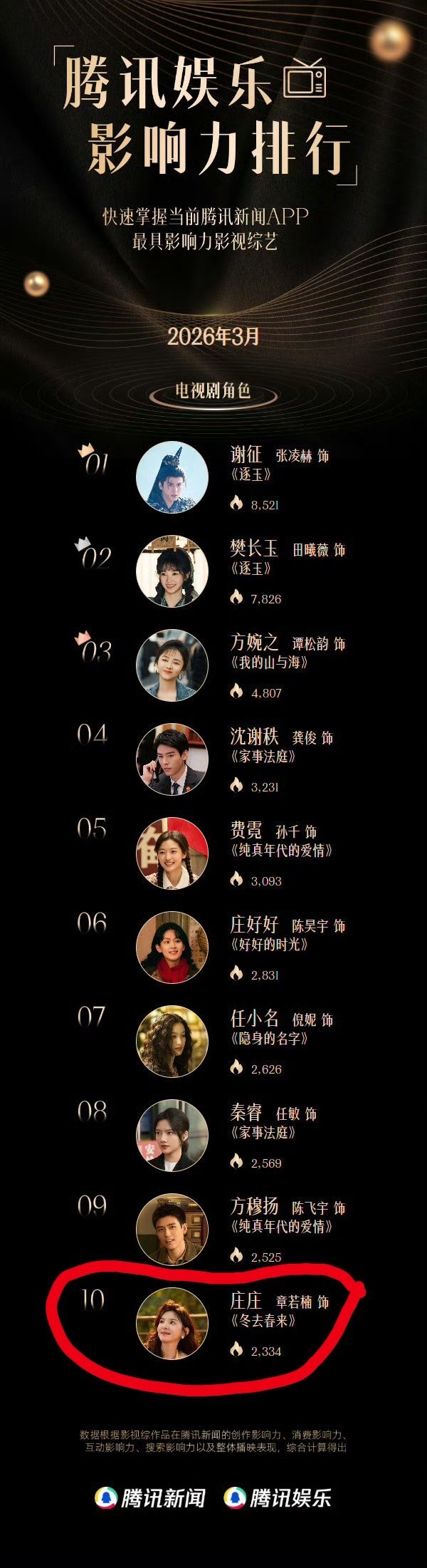 3月腾讯娱乐影响力剧集角色top10章若楠《冬去春来》庄庄角色进入前十名,这部剧3月份才播几天诶,而且还是这部剧唯一上榜的角色