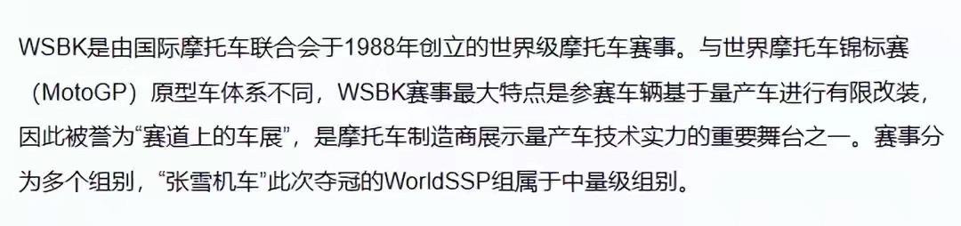 夺冠才两天,人民日报接连点名张雪,释放三个强烈信号,字字珠玑 谁也没有想到,两场摩托车比赛,竟然带动了整个中国制造业的欢呼与震动。 3月28号、29号,来自中国的张雪机车,拿下了世界超级摩托车锦标赛的两连冠。 无论是获奖名次还是赛道表现,都远超大家赛前的成绩预测。 你知道这两场比赛意味着什么吗?不是一块金牌,不是一座奖杯,是中国人自己造的摩托车,在世界顶级赛道上,把那些几十年垄断领奖台的日本、欧洲老牌厂商,生生甩在了身后。 夺冠的那一刻,我脑子里蹦出来的是几十年前那本书——《体育于人生》。书里说,体育的终极意义,不是赢了谁,是证明我们能行。张雪机车这两场胜利,证明的不光是车手能行,是中国的工程师能行,是中国的产业链能行,是“中国制造”这四个字,再也不是廉价、模仿、低端的代名词。 咱们先说说这条赛道。世界超级摩托车锦标赛,简称WSBK,玩摩托的人都知道,这是量产摩托车赛事的最高殿堂。能在上面跑的车,不是那种烧钱堆出来的概念车,是你在专卖店能买到的量产车。所以这比赛比的不是谁钱多,是比谁的造车技术硬。过去几十年,这个领奖台基本被日本四大厂和欧洲那几个老牌子包圆了。中国人?想都不敢想。 张雪机车第一次参赛,两连冠。什么叫“远超赛前预测”?赛前没人觉得中国车能跑进前十,结果人家不但跑完了,还拿了两站第一。这打脸打得,那些老牌厂商的工程师怕是连夜开会。 人民日报两天内接连点名,这事儿不寻常。要知道,人民日报不是体育报,它不轻易为一场体育比赛连发两篇文章。它点名,是因为张雪机车这件事,已经超出了体育范畴,成了一个标志——一个中国制造业从跟跑到领跑的标志。 咱们再往深了挖一层。张雪机车是谁?不是什么国家队,不是什么央企巨无霸,是一家民营企业。它的创始人张雪,网上能搜到,就是个痴迷摩托车的理工男。这种草根出身、靠技术硬磕出来的企业,能站在世界之巅,比任何“国家扶持”“政策倾斜”都更有说服力。因为它证明了,在中国的土壤上,哪怕你不靠关系、不靠背景,只要技术够硬、心够沉,就能杀出一条血路。 这才是人民日报真正想说的东西。 你看现在的舆论场,一说中国制造,有人吹上天,有人踩到底。吹的人说我们什么都行,踩的人说我们只会山寨。可张雪机车这两场胜利,把这两种声音都堵住了。它告诉全世界:中国不是什么都行,但在某些领域,我们已经行到了能让老牌列强坐不住的地步;中国也不是只会山寨,我们有自己的工程师、自己的技术路线、自己的速度。 我查了一下资料,张雪机车这次夺冠用的发动机,是自主研发的。这意味着什么?意味着从设计图纸到铸造工艺,从材料配方到装配精度,全是中国人自己搞定的。过去我们总说“卡脖子”,发动机就是最典型的“脖子”。现在,我们自己造的发动机,跑赢了日本和欧洲的,这脖子,算不算松了松? 再说说这场比赛对普通人的意义。很多人不骑摩托,觉得这事儿跟自己没关系。可你想想,一个国家的工业水平,最后落到每个人头上的,就是生活里那些东西。我们买的车、用的家电、甚至手机里的芯片,背后都是制造业的较量。张雪机车今天能在赛道上跑赢,明天就能在民用市场上拿出更好的产品。这场胜利,最后会变成你口袋里省下的钱,变成你买到手的东西。 我有个朋友是做汽车零部件的,他说他们行业有个说法:赛道上跑出来的技术,三到五年就会下放到民用。张雪机车在赛道上验证的那些技术,过几年可能就在你买的国产摩托车上,甚至国产汽车上。这不是做梦,这是工业发展的规律。 回到人民日报的点名。我仔细看了那两篇文章,字不多,但每个字都重。它不是在夸一个企业,是在肯定一种精神——那种不被看好、不被承认、硬是靠技术和热爱闯出来的精神。这种精神,比金牌值钱。 张雪机车的两连冠,像一根火柴,把很多人心里那团火又点燃了。原来我们也可以,原来我们不比谁差,原来只要踏踏实实干,总有人看得见。 当然,赢了比赛不是终点。摩托车工业的路还长,发动机的可靠性、底盘调校、电控系统,每一项都还有提升空间。但至少,我们已经在赛道上了,而且跑在了前面。 最后我想说,张雪机车的两连冠,不是一个人的胜利,是一个行业的胜利,是一个国家的胜利。它告诉我们:技术这个东西,没有捷径,只有死磕。你磕得够久,世界就能听见你的声音。 各位读者你们怎么看?欢迎在评论区讨论。