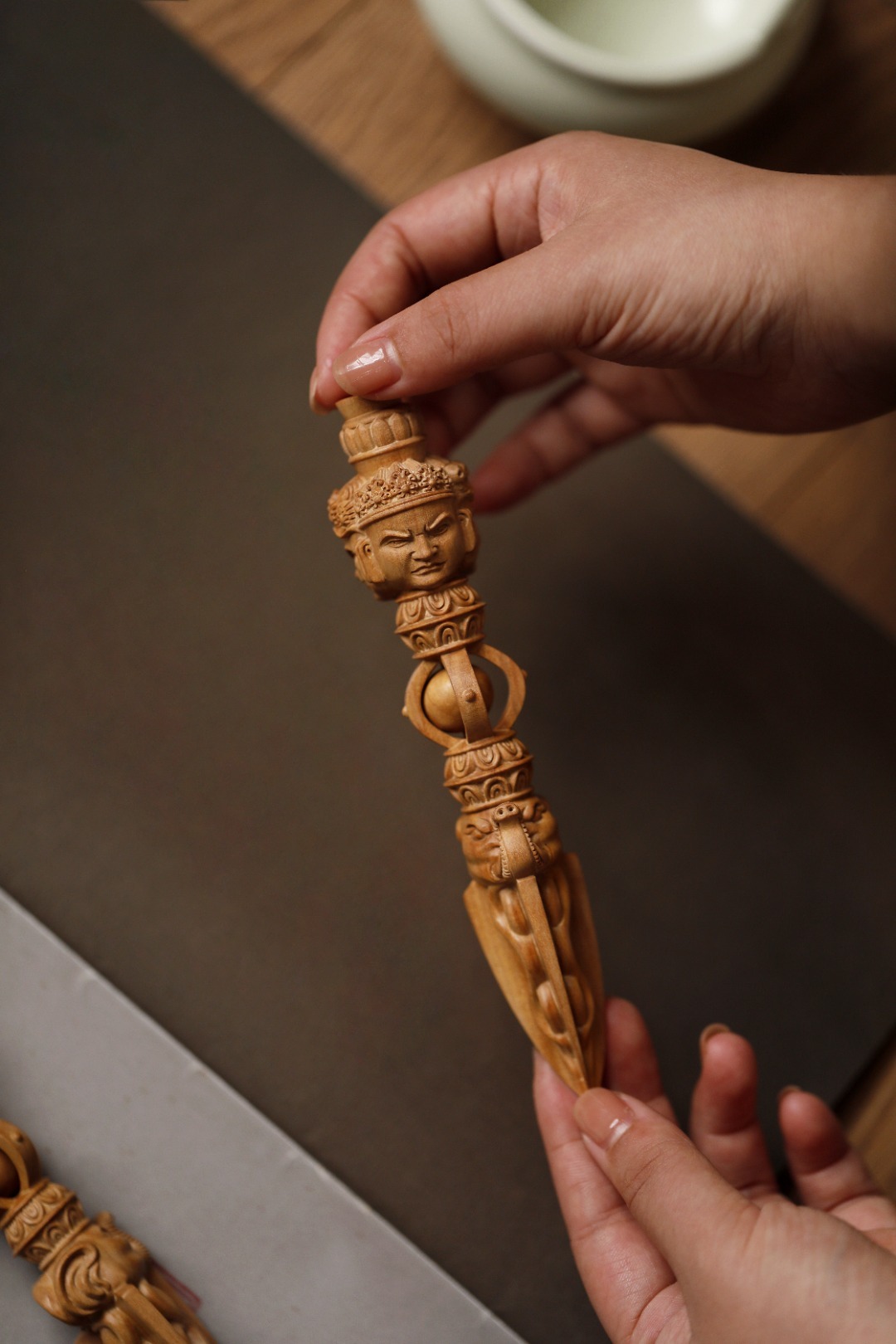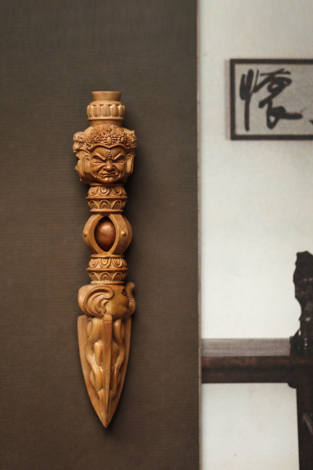 择料细腻凝润,雕刻精湛,降魔杵在佛教密宗中,象征着所向无敌、无坚不摧的智慧和真如佛性。