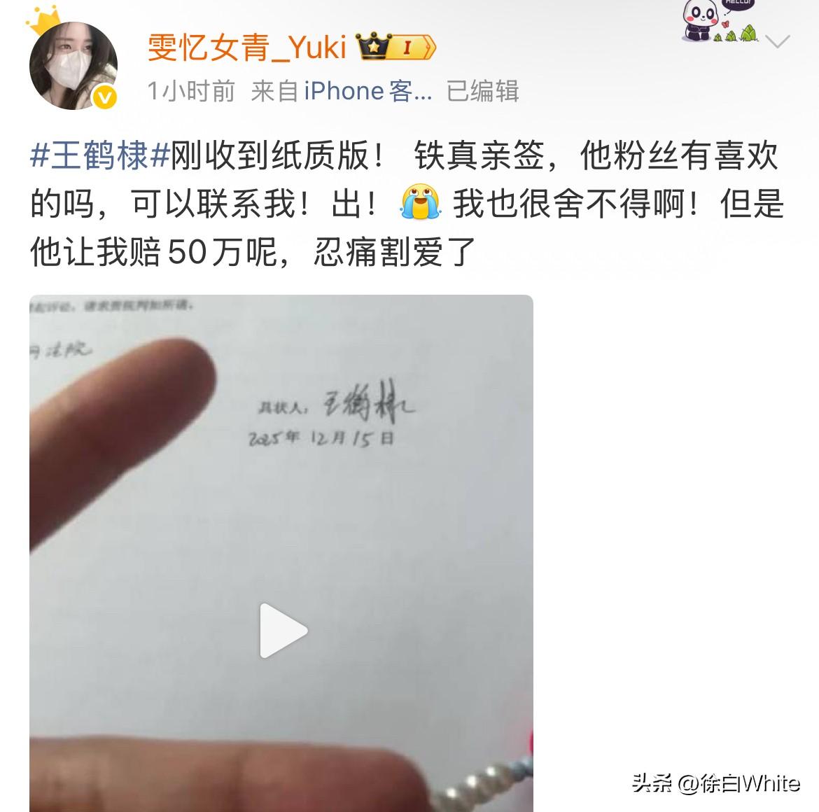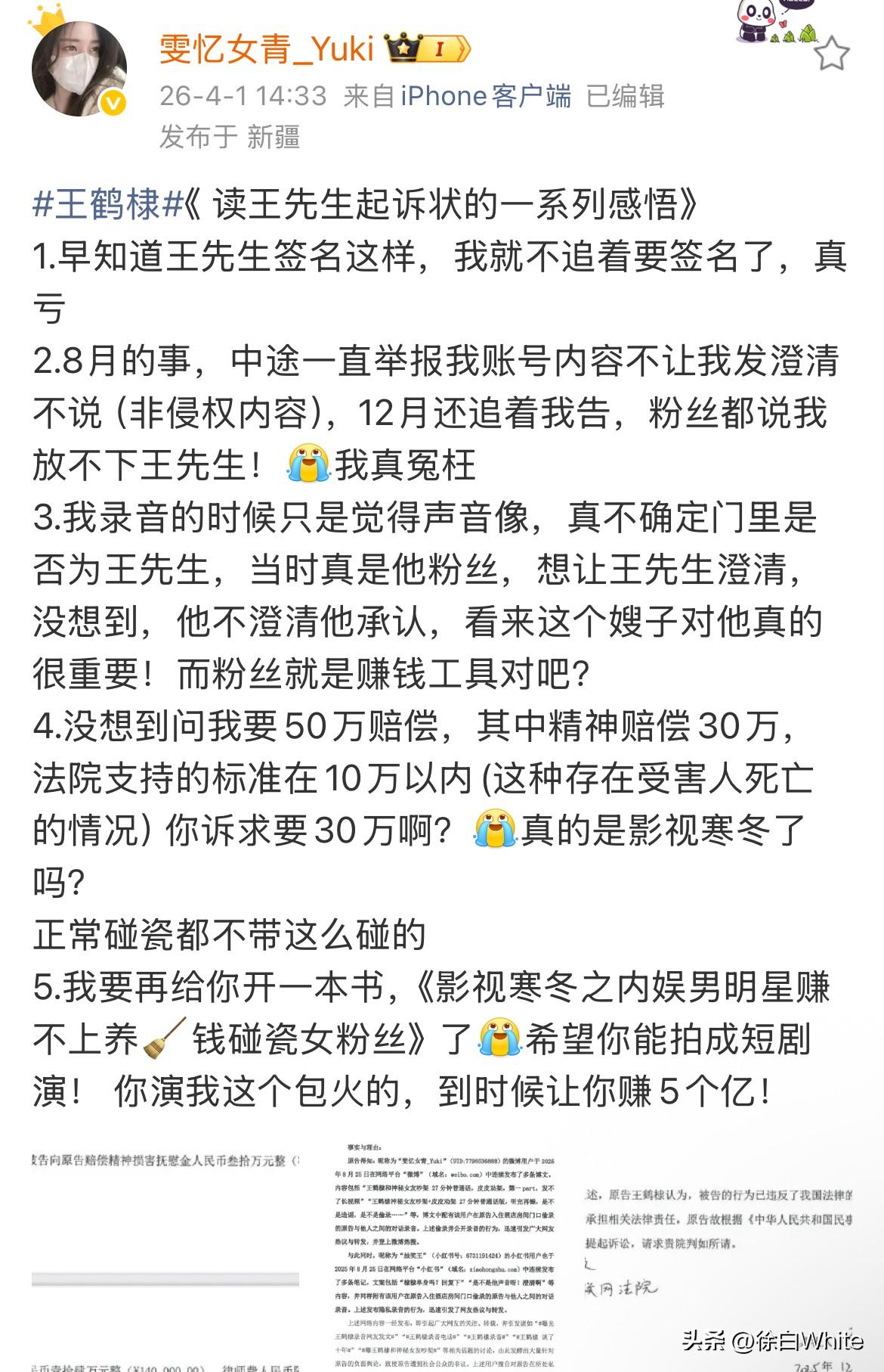 4月1日,爆王鹤棣与女生对话录音的网友发文,称王鹤棣碰瓷她,让她赔50w! 发王鹤棣诉状亲笔签名,喊话有没有人想要,打算通过这种方式弥补一点自己的损失! 通过该网友所发的《读王先生起诉状的一系列感悟》得知,她之前是王鹤棣的粉,现在不是了,一开始只是觉得声音像,后面没想到王鹤棣承认声音是他的,吐槽王鹤棣索赔金额太高,并表示要给王鹤棣再写一本书…… 如果不是这个网友发文,都快忘记之前王鹤棣录音的事了,没想到是真的,不过谈恋爱这事很正常,摩擦也很正常,属于个人的事,不打扰,录音公开确实给王鹤棣带来了不小的困扰,赔偿应该最终会协商低点吧!
