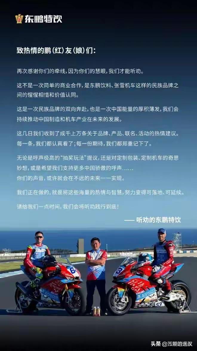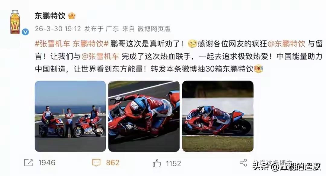 东鹏特饮这次真的赢在了格局!不纠结短期ROI,只因追梦精神契合就果断赞助,还全靠网友牵线,这份“听劝”与初心太难得。张雪从辍学修摩托到为国夺冠,励志故事戳中所有人,民族自豪感拉满。网传5万赞助费的段子虽假,却更凸显这次合作的传奇性。比起精打细算的流量投放,这种坚守品牌底色、支持国潮追梦的选择,才是品牌最珍贵的价值,也让东鹏真正走进了大众心里。 东鹏运动饮料