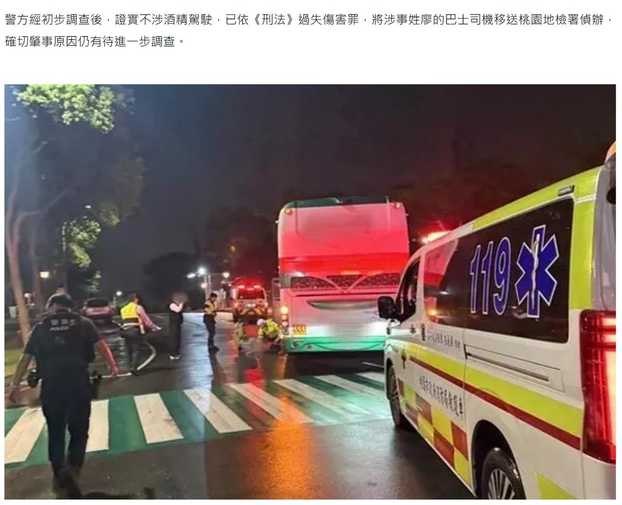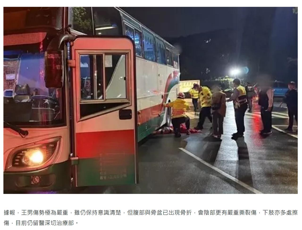 澳门学生在台湾遇恐怖车祸。 一名20岁赴台学习的澳门男大学生遭巴士撞倒并辗过,下半身严重受创。 事发在本月26日晚上约10时20分,54岁姓廖的男子驾驶巴士行经长庚大学校园内道路,准备左转时不慎撞倒正在斑马线上行走的20岁姓王的男大学生。 王男挨撞后被卷入车底,下半身遭巴士左前轮辗压,被困车底。救护人员接报赶至将伤者救出,并紧急送往林口长庚医院。 据报,王男伤势极为严重,虽仍保持意识清楚,但腹部与骨盆已出现骨折,会阴部更有严重撕裂伤,下肢亦多处擦伤,目前仍留医深切治疗部。 当地警方表示,经翻查闭路电视画面,确认巴士撞人后已即时煞停,司机亦有第一时间下车查看伤者,并无多次来回辗压的情况。 警方经初步调查后,证实不涉酒精驾驶,已依《刑法》过失伤害罪,将涉事姓廖的巴士司机移送桃园地检署侦办,确切肇事原因仍有待进一步调查。