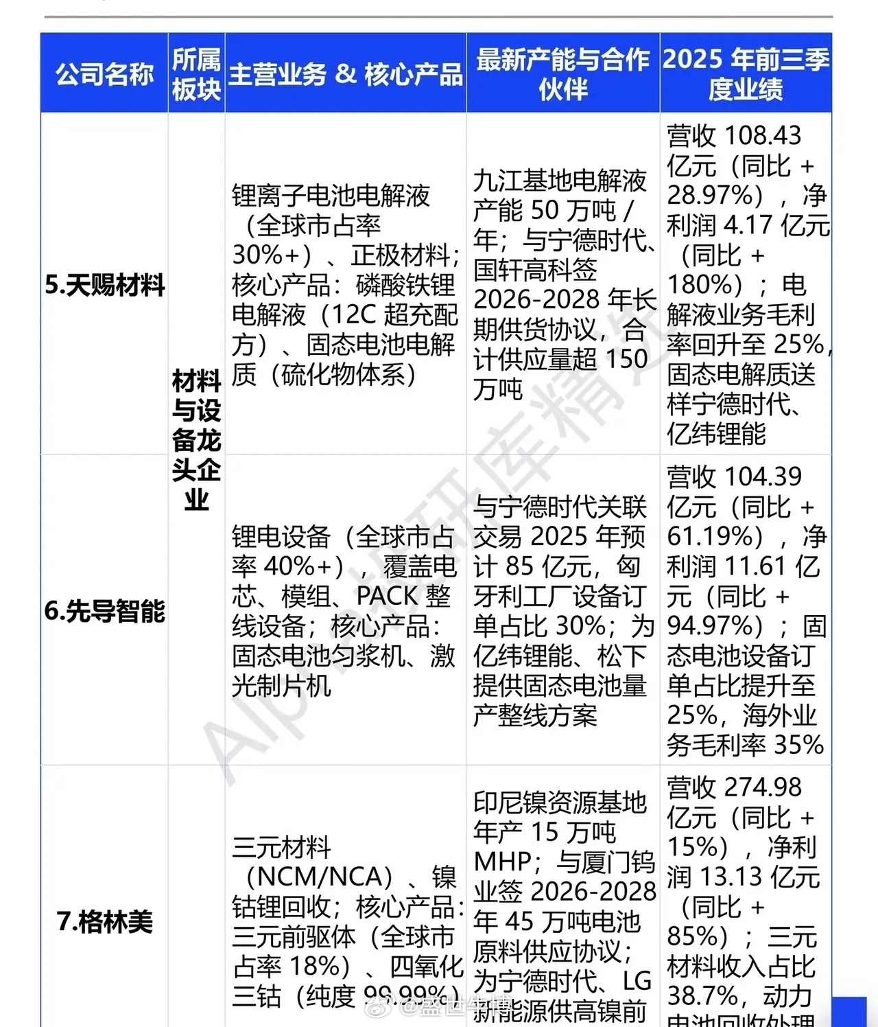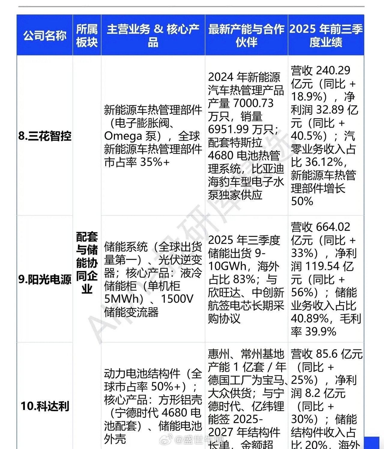 锂电储能核心十杰:解码赛道黄金标的在全球能源转型的浪潮中,锂电储能正从新能源产业的“配套环节”跃升为核心增长极。2025年中国储能锂电池出货量达630GWh,同比激增85%,行业供需错配催生产能紧缺,头部企业订单排期甚至延伸至2026年上半年。在此背景下,这十家上市企业凭借技术壁垒、产能优势与业绩高增,成为赛道发展的核心锚点。宁德时代与亿纬锂能稳居动力电池与储能核心阵营。宁德时代神行磷酸铁锂电池能量密度达160Wh/kg,2025年前三季度储能业务营收占比15.88%,海外储能订单超100GWh,以35%+的全球市占率筑牢龙头地位;亿纬锂能则以Mr.Big储能大电池(628Ah)、半固态电池为核心,2025年前三季度储能业务收入同比增长120%,与澳大利亚EVO Power等企业的深度合作进一步夯实产能基础。国轩高科与欣旺达聚焦技术突破与产能扩张。国轩高科标准化电池循环寿命超10000次,合肥、南京基地合计产能超100GWh,2025年前三季度储能业务收入占比23.52%;欣旺达“欣·碧霄固态电池”能量密度达400Wh/kg,泰国二期17.4GWh动力电池项目落地,储能系统出货量同比增长2100%,成为储能赛道的强劲黑马。天赐材料、先导智能与格林美筑牢产业链材料与设备基石。天赐材料磷酸铁锂电解液全球市占率30%+,九江基地产能达50万吨/年,为头部企业提供核心电解液支撑;先导智能锂电设备全球市占率40%+,为亿纬锂能、松下等企业提供固态电池量产整线方案;格林美深耕三元前驱体与镍钴锂回收,三元前驱体全球市占率18%,为行业循环发展提供保障。三花智控、阳光电源与科达利则是储能配套的核心协同者。三花智控新能源车热管理部件市占率35%+,配套特斯拉、比亚迪等头部车企;阳光电源储能系统全球出货量第一,2025年前三季度储能业务净利润同比增长56%,液冷储能技术领跑行业;科达利动力电池结构件全球市占率50%+,为宁德时代、亿纬锂能提供核心配套,海外收入占比达45%。从动力电池到储能系统,从核心材料到配套设备,这十家企业构成了锂电储能的完整生态链。随着2026年储能市场出货量有望突破850GWh、首次超越动力电池,这些具备技术、产能与订单优势的核心标的,将持续分享行业爆发红利。