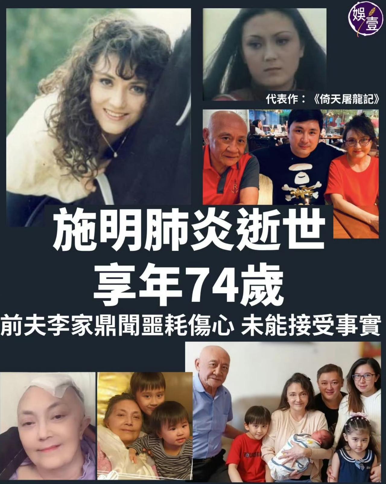 香港演员施明去世。 李家鼎前妻施明年前在家中意外跌倒而头部重创,需接受开脑手术。在医院接受长达一年的治疗后,终于回到家人身边。昨晚传出施明因肺炎抢救无效,于3月21日离世,享年74岁。