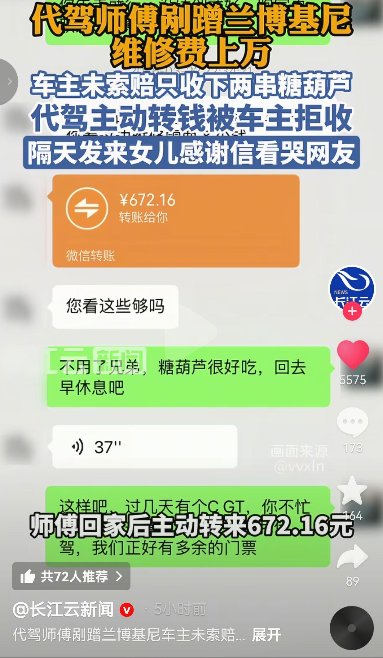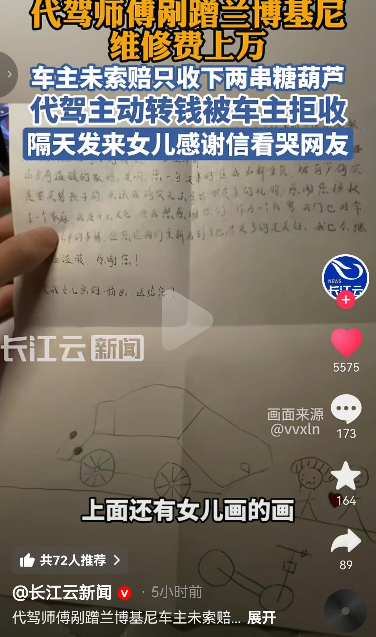 太暖心了!代驾师傅雨夜剐蹭兰博基尼,维修费直接上万,车主不仅没索赔,连师傅主动转的钱都拒收了,最后只收下两串糖葫芦!网友:这才是刻在中国人骨子里的善良啊! 近日,湖南长沙,一个下着大雨的深夜,代驾师傅骑着电动车接单,路滑视线差,一不小心,直接剐蹭到了停在路边的兰博基尼。 当时那一下,师傅整个人都懵了! 他抬头一看,那车的损伤,维修费少说也要1到3万! 这是什么概念?代驾师傅跑一单才几十块,这一下,等于大半个月甚至一个月白干了! 换做别的车主,早跳起来骂街、扣人、要赔偿了! 可这位车主王先生,下车一看,第一句话不是追责,不是索赔,而是先问师傅:“人没事吧?有没有受伤?” 得知师傅是代驾,下雨天还在跑单,王先生当场就心软了:“下雨天还出来跑代驾,太不容易了,车我自己修,不用你赔!” 师傅当时就红了眼,赶紧去路边买了两串糖葫芦,塞给王先生,说这是本来买给孩子的,算是一点心意。 王先生不仅没要赔偿,连糖葫芦的钱都给师傅退回去了,只收下了那两串糖葫芦,还催着师傅:“赶紧去完成订单,别耽误你挣钱!” 你以为这就完了? 师傅回家后,越想越过意不去,主动给王先生转了672.16块钱,说这是自己能拿出来的全部了。 结果王先生直接把钱退了回去,还跟师傅说:“不用了兄弟,糖葫芦很好吃,回去早点休息吧。” 更绝的是,第二天,师傅给王先生发来了一封手写的感谢信,还有女儿画的一幅画! 画里,是当时的事故现场:代驾师傅骑着车,旁边是兰博基尼,师傅在哭,车主笑着递给他一颗红心。 字里行间,全是师傅的感激:“您一句没事,让我如释重负。我没什么文化,但我想感谢你们,作为一个代驾,我们也有尊严。这件事,让我们重新看到了世界更多的美好,我已么狠温暖,谢谢您!” 王先生看到信和画,当场就破防了,不仅把画分享了出来,还说要邀请师傅去看CGT,给了多余的门票。 这是什么神仙双向奔赴啊! 网友看到后评论说:我直接破防了!这才是真正的善良!车主不欺负底层人,师傅不逃避责任,双向的温暖太好哭了! 也有的网友说:换做别的车主,早把代驾讹得底朝天了!这车主格局直接拉满!活该他开兰博基尼! 还有的网友说:看到小女孩的画我直接哭了!这就是最好的教育!爸爸的善良,孩子都看在眼里! 也有的网友说:太感动了!我们代驾天天在路上跑,最怕的就是蹭到豪车,这位车主给了我们所有代驾尊严! 说实话,我看完这个事,眼泪直接止不住了! 这哪里是一起简单的交通事故?这是两个普通人,用最朴素的善良,给这个冰冷的世界,狠狠上了一课! 代驾师傅,没跑、没躲、没耍赖,剐了车,第一时间想着赔偿,哪怕自己没钱,也要把能拿的都拿出来,这是担当! 车主王先生,开着上百万的豪车,没仗势欺人,没趁火打劫,反而体谅师傅的不容易,主动放弃索赔,这是格局! 更难得的是,师傅懂得感恩,用糖葫芦、用感谢信、用女儿的画,把这份善意传递下去;车主懂得尊重,把钱退回去,把温暖传回来,这是双向的奔赴! 现在这个社会,太多人眼里只有钱,只有利益,蹭到豪车,要么讹诈,要么甩锅,可这两个人,用行动告诉我们:善良,永远比钱更值钱!尊重,永远比豪车更珍贵! 我就想问,有多少人,能在自己的车被剐蹭、维修费上万的时候,第一反应不是要钱,而是关心对方人没事吧? 又有多少人,能在闯了大祸、面临巨额赔偿的时候,不跑不闹,主动承担责任? 这才是最难得的! 我们总说世态炎凉,可总有人,用自己的善意,温暖着这个世界! 这件事,从来都不是钱的事,从来都不是车的事! 它让我们看到,这个世界上,最珍贵的从来不是豪车豪宅,而是刻在骨子里的善良,是对他人的体谅,是双向奔赴的温暖! 我们感动,是因为我们在这两个人身上,看到了人性的光辉,看到了普通人之间最纯粹的善意! 代驾师傅的担当,车主的格局,小女孩的画,凑成了这个春天最暖的故事! 善良从来都不是单向的,你给世界一份温柔,世界就会还你一份温暖! 最后,我想说的是:善良从来都有回响,你给世界的每一份温柔,终会回到自己身上! 对此,你怎么看?