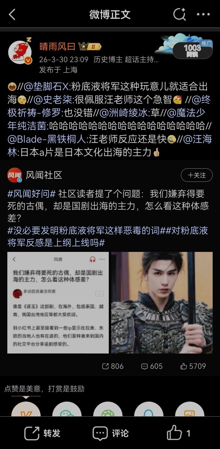 更有像汪海林这样的“圈内人”调侃“古偶”剧,在点评自媒体“社区读者提了个问题:我们嫌弃得要死的古偶,却是国剧出海的主力,怎么看这种体感差?”这个提问时,以一句“日本a片是日本文化出海的主力”作为评论,表达了不屑。(图4)