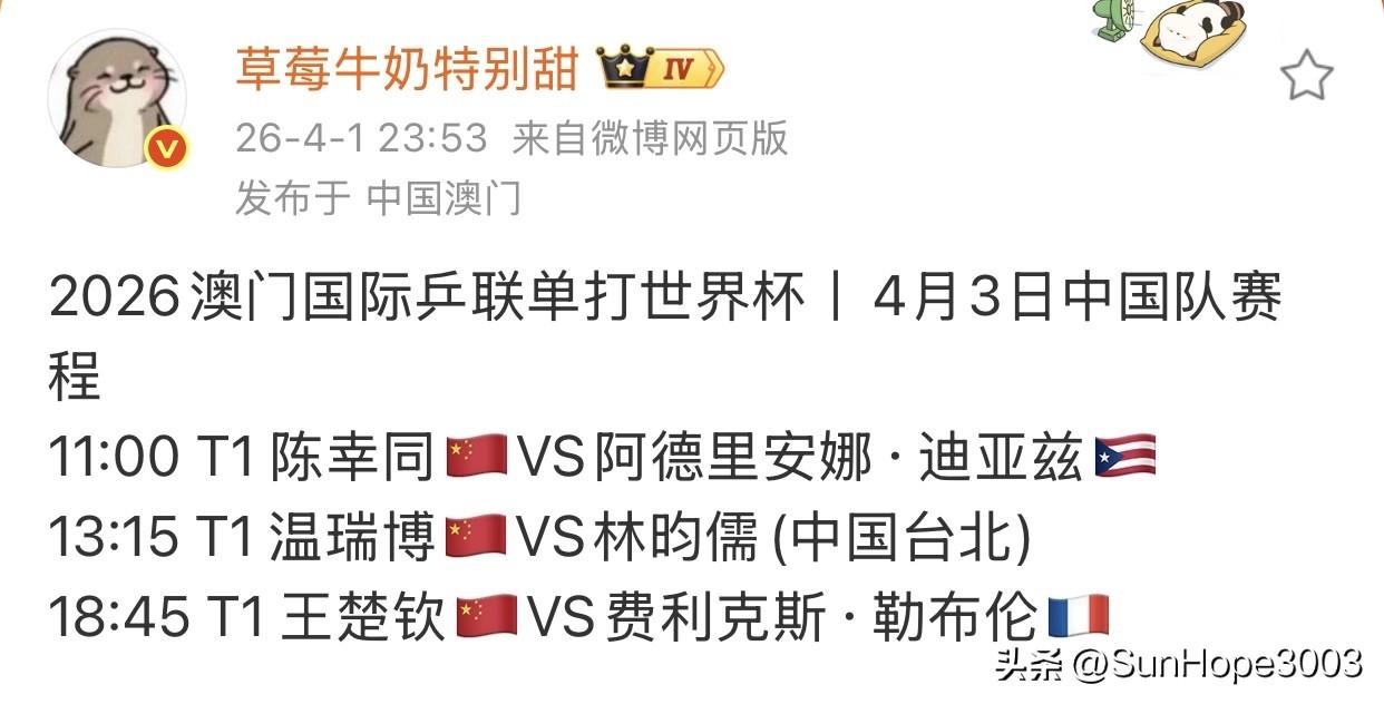 澳门世界杯2日3日赛程表,孙颖莎王楚钦比赛时间 澳门世界杯进入了淘汰赛,抽签结束,现在比赛时间也已经出来了, 1/8决赛, 孙颖莎等五位国乒选手在2号比赛, 其中莎莎和蒯曼首轮内战。 覃予萱首场11点比赛, 莎莎晚上6点比赛。 王楚钦温瑞博陈幸同在3日比赛, 王楚钦比赛时间是晚上的6点45。 莎莎楚钦加油,中国队加油!