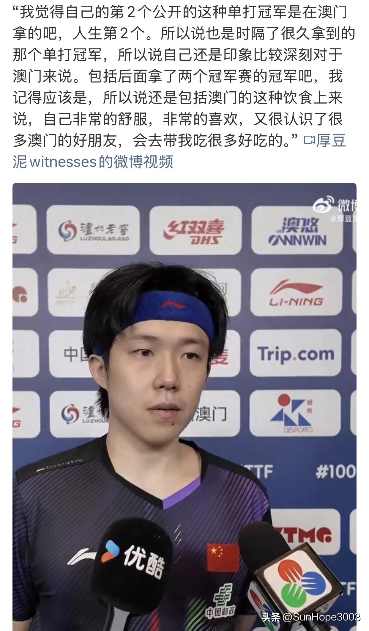 王楚钦确实思路清晰,对于“稳定发挥”这个词的解释特别到位, 另外也看到了澳门对于王楚钦来说不一样。 王楚钦说的太好了,稳定发挥更多的是说一个人的成熟度,包括心态上。 但是它的形式是因人而异的, 每个人的打法风格不一样, 所以,稳定还是凶狠,还是果断,都不一样。 谈到澳门,王楚钦说自己在澳门拿到过几个冠军, 都是印象深刻的, 并且这里有美食,也有自己的朋友, 很喜欢这里。
