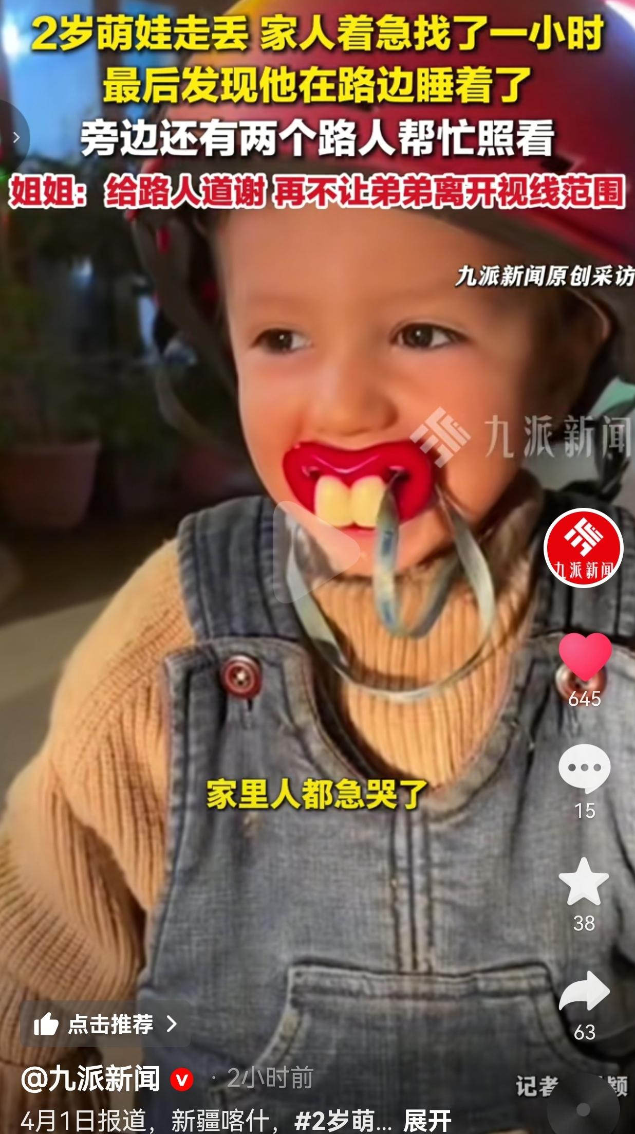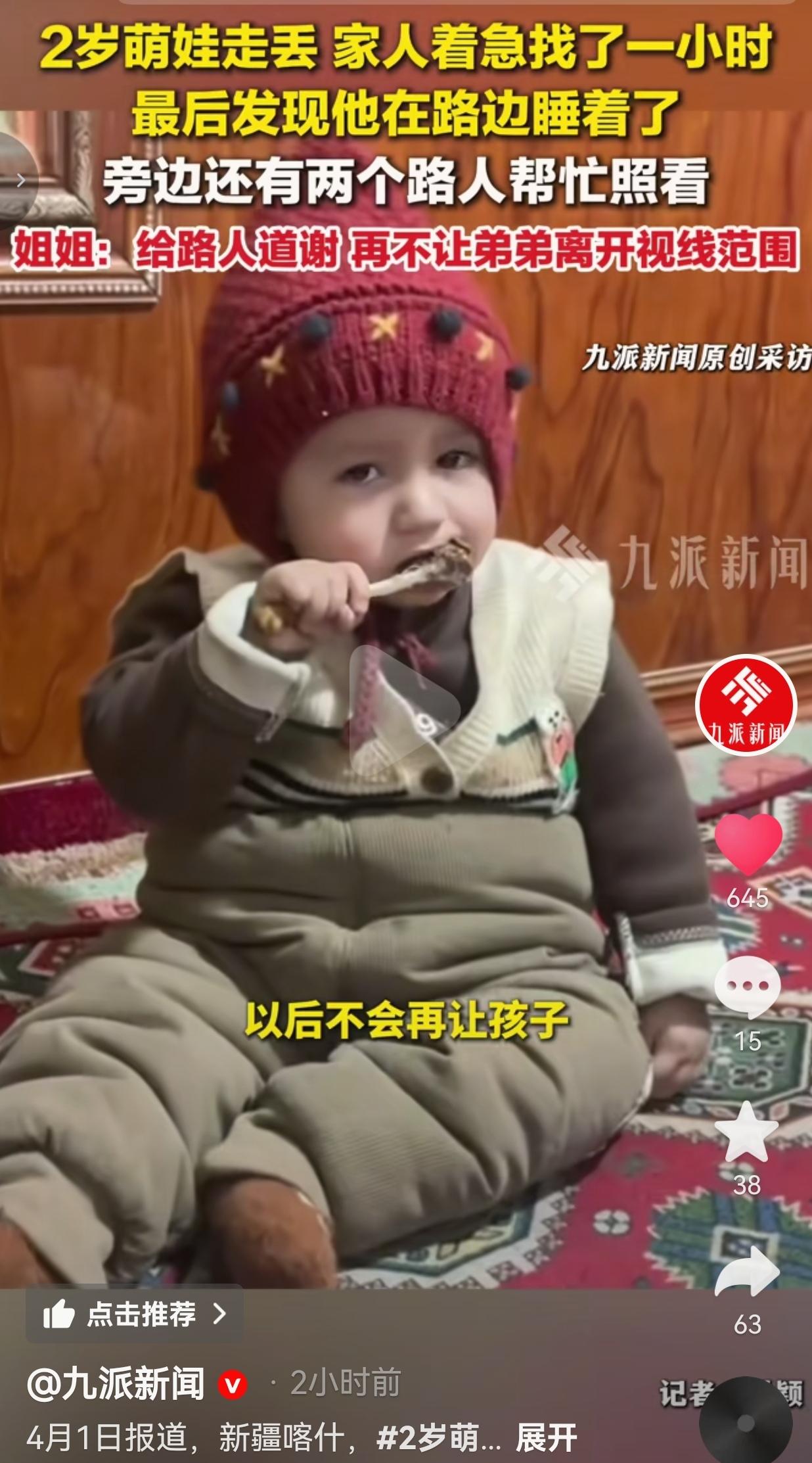 看哭了!2岁萌娃在家门口玩耍,一转眼就没了踪影,全家急得发疯找了整整一小时,最后竟在马路边发现他抱着玩具车睡得香!更暖的是,两个陌生路人默默守护了孩子一小时,这才是刻在中国人骨子里的善良啊! 新疆喀什,4月1日,2岁的弟弟本来在家门口玩,家人就转身忙活了一下,再一抬头,孩子直接没影了! 全家瞬间炸了锅,姐姐、爸妈、亲戚全出动,大街小巷疯找,眼泪都急出来了,就怕孩子出点什么意外! 要知道,孩子才2岁,路边全是来来往往的汽车,万一被车碰了、万一被人抱走了,后果不堪设想! 整整一个小时,全家都在崩溃的边缘,直到有人发现,孩子竟然在马路边的路牙子上,抱着自己的蓝色玩具车,睡得死死的! 更让人感动的是,孩子旁边,一直守着两个陌生路人! 他们发现孩子一个人在路边睡觉,怕孩子出事、怕被车碰到,就一直守在旁边,没敢离开,也没敢吵醒孩子,就这么默默守护了整整一个小时,直到家人找到! 姐姐说,看到孩子的时候,他还抱着玩具车睡得香,完全不知道自己在鬼门关走了一圈。 家人当场就给两个路人跪下道谢,姐姐更是说,以后再也不会让弟弟离开自己的视线范围,绝对吸取这个教训! 网友看到后评论说:我直接哭了!当妈最看不得这种事!还好有两个好心人守着,不然真不敢想! 也有的网友说:这两个路人太伟大了!默默守护不声张,这才是真正的善良! 还有的网友说:还好孩子没事!这家人真的要好好谢谢这两个路人,救命之恩啊! 要我说,这哪里是一起简单的孩子走失事件?这是两个陌生人,用最朴素的善良,给了一个孩子第二次生命! 换做别人,看到路边一个睡着的孩子,可能直接就走了,多一事不如少一事,可这两个路人,选择留下来,守了整整一个小时! 他们没要报酬,没留名字,就这么默默守护,直到家人找到,这是什么格局?这是什么善良? 我们总说世态炎凉,可总有人,用自己的行动,温暖着这个世界! 更难得的是,孩子家人懂得感恩,当场道谢,还说以后绝对看好孩子,这是双向的温暖! 我就想问,有多少人,能在看到一个陌生孩子在路边睡觉的时候,选择留下来守护? 又有多少人,能在孩子走失后,遇到这样的好心人?这才是最难得的! 我们愤怒,是心疼孩子的遭遇;我们感动,是感谢路人的善良;我们警醒,是提醒所有家长,孩子的安全,容不得半点马虎! 2岁的孩子,根本不知道危险,路边的车、陌生的人,每一个都是隐患,家长一秒钟的疏忽,都可能造成一辈子的遗憾! 这件事,给所有家长狠狠上了一课:孩子的安全,永远是第一位的,绝对不能让孩子离开自己的视线! 同时,也谢谢这两个陌生的路人,是你们的善良,拯救了一个家庭! 这件事,从来都不是孩子走失这么简单! 它让我们看到,这个世界上,最珍贵的从来不是金钱,而是陌生人之间的善意,是刻在骨子里的善良,是对生命的敬畏! 我们感动,是因为我们在这两个路人身上,看到了人性的光辉,看到了普通人之间最纯粹的温暖! 善良从来都不是惊天动地的大事,而是在别人需要的时候,伸出的一只手,默默的一份守护! 别让冷漠凉了人心,别让疏忽害了孩子! 善良是照亮世界的光,守护每一个孩子,就是守护我们的未来!