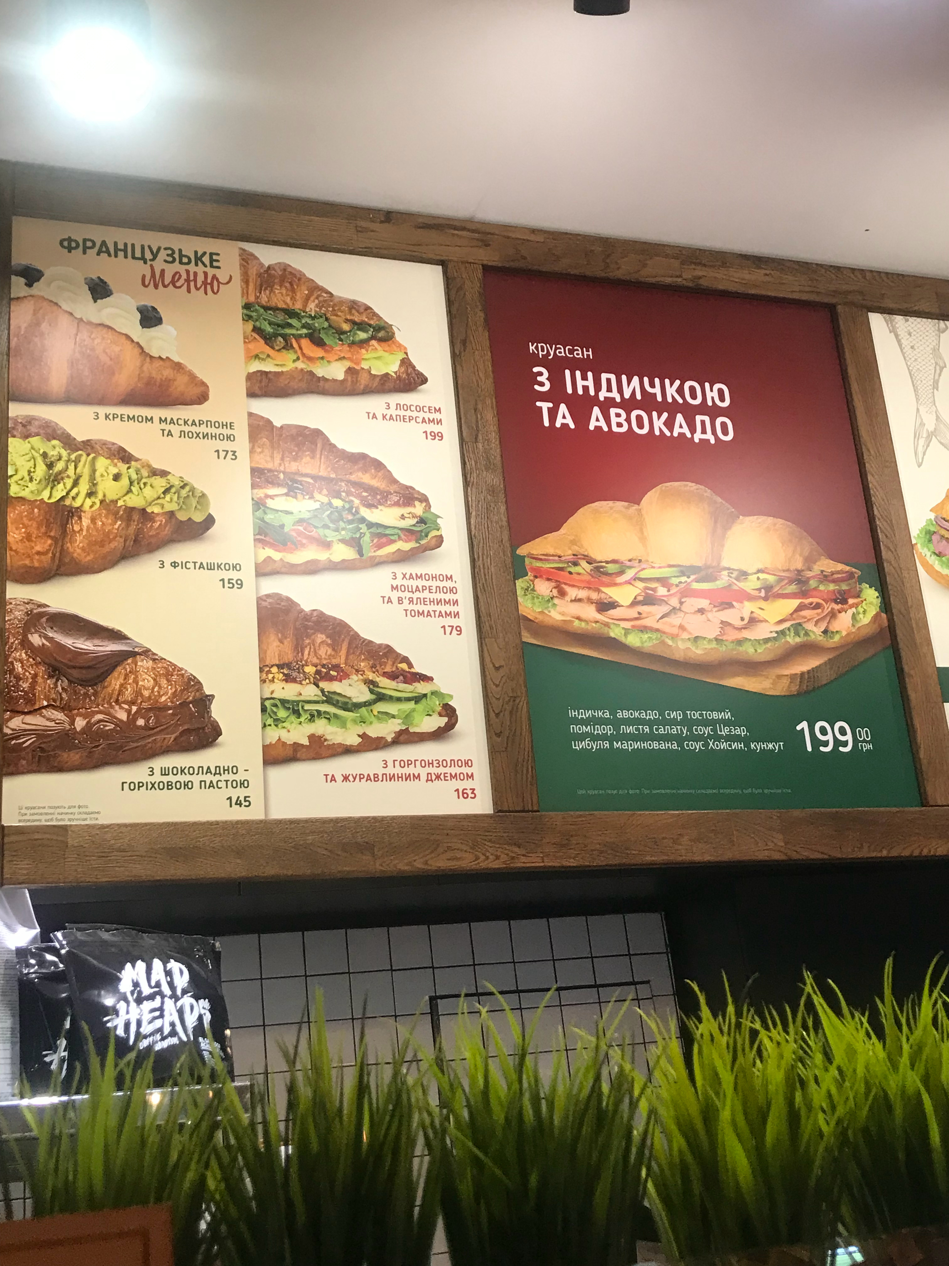 照片里是我住处附近的一家。他们就是单品策略,把乌克兰传统的羊角包塞上馅料。一个20几块到30几块,图中价格➗6约为人民币。 乌克兰·基辅