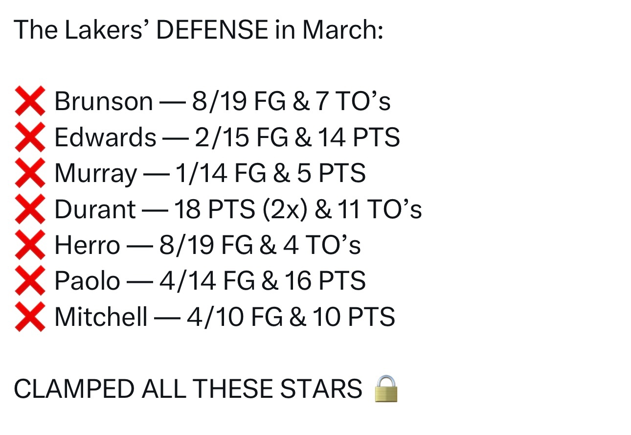 湖人上个月防守效率能排到联盟第十,多场比赛让对方主要得分手吃瘪
