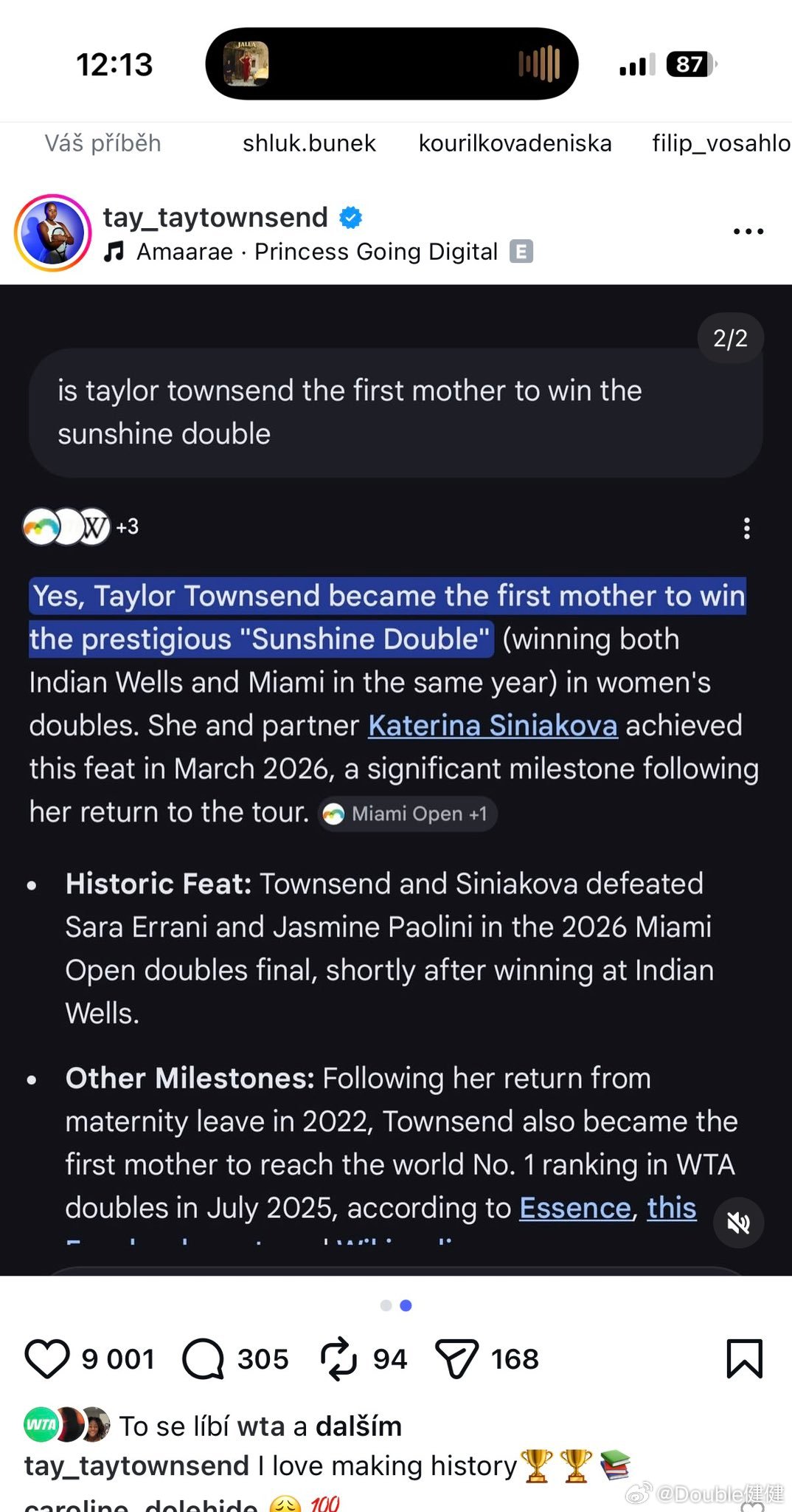 汤森德问AI自己是不是第一个夺得阳光双冠的妈妈级选手!得到肯定回答后,汤森德晒在社交媒体上:我爱创造历史🏆红土撒野季wta