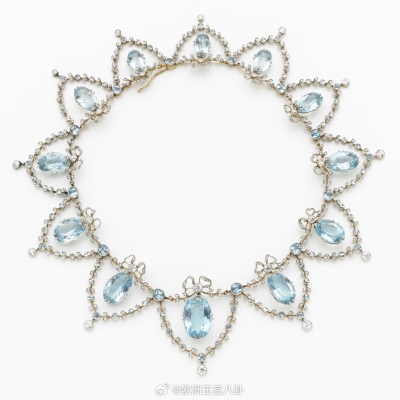珠宝 曾属于普鲁士公主维多利亚-露易丝(小七)的海蓝宝项链,是1913年她嫁给汉诺威继承人恩斯特·奥古斯特结婚时的结婚礼物。送礼方为末代沙皇尼古拉二世夫妇,项链制作方大概率为法贝热项链在1996年和2016年各卖一次,第二次估价为5.5-8.5w欧。小七有5个儿女孙辈更多,不造谁卖的,可惜没佩戴图