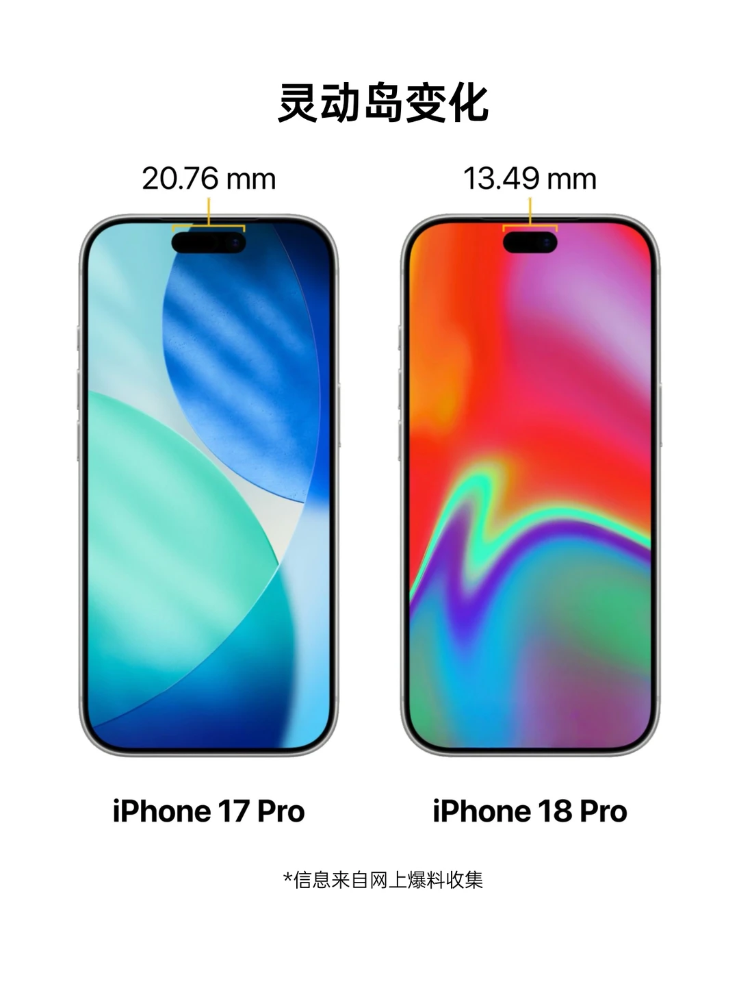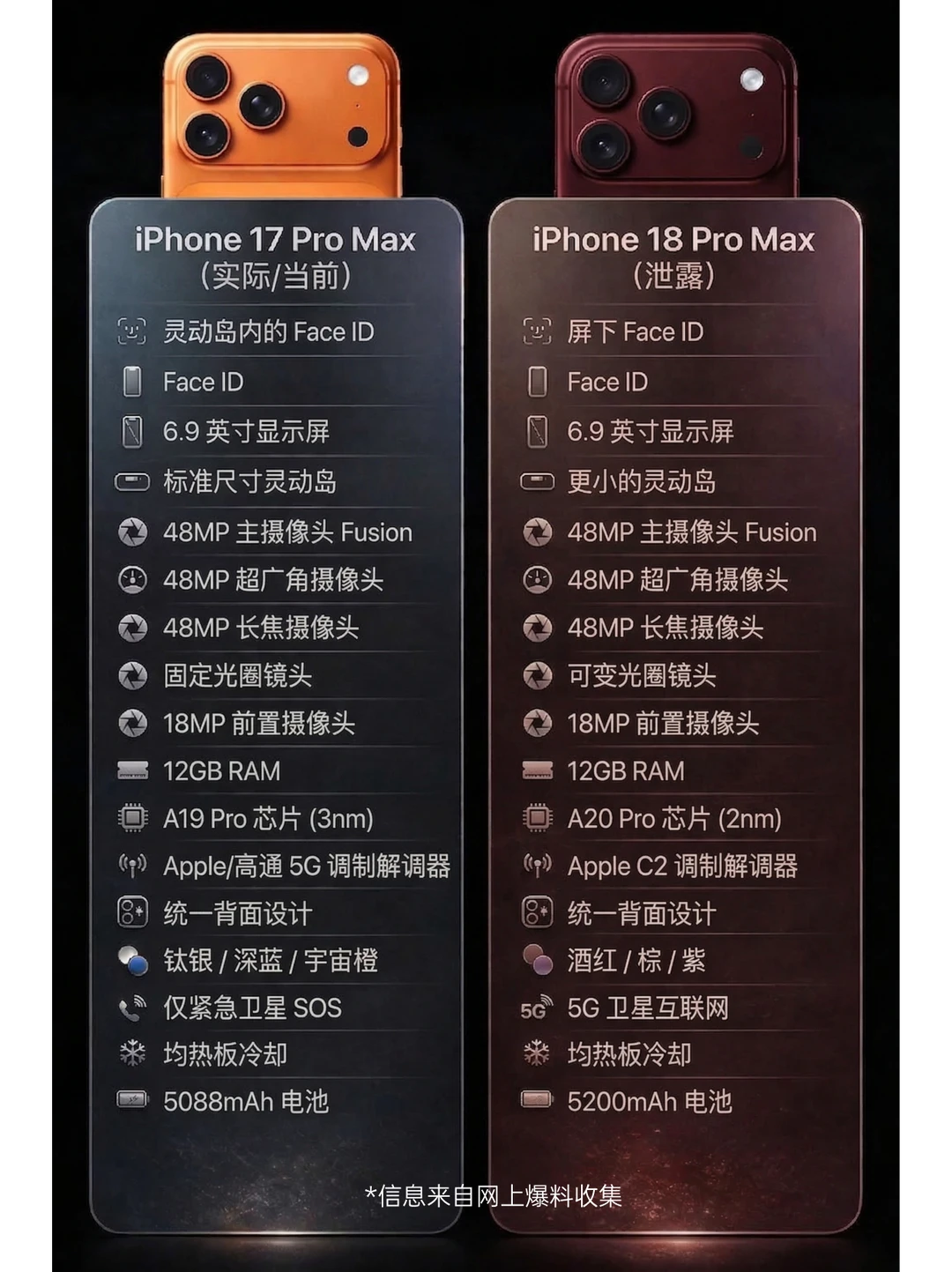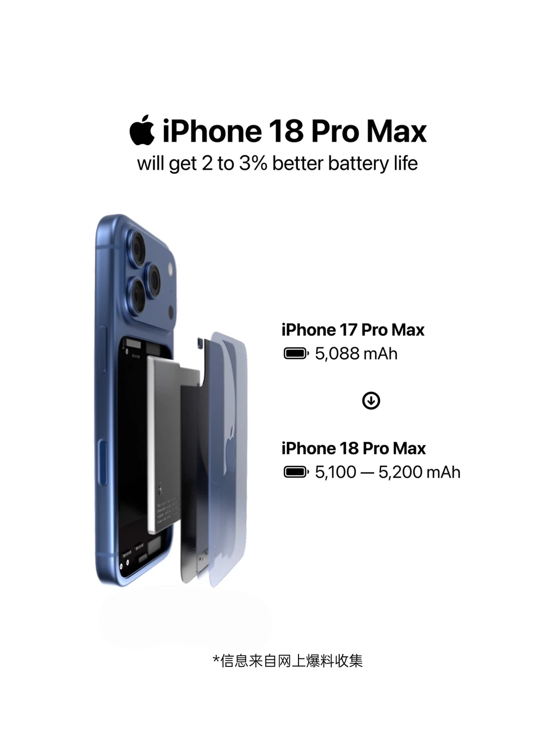 果粉宝们,分享一波可靠iPhone18前瞻资讯[清单R] 主要表现为全系内存升级、Pro系列影像设计和灵动岛的实质性大改变。 _ 性能与内存(告别内存焦虑) 🔸全系 A20 芯片:预计采用台积电最先进的 2nm 工艺,性能和能效比会有明显的提升。 🔹内存大普及(告别8GB):为了让更聪明的 Siri 和 Apple Intelligence(苹果智能)跑得更溜,标准版有望彻底告别 8GB,全系 12GB 运行内存起步,Pro 系列甚至可能更高。 . 📱 屏幕与外观(灵动岛真要变小了) Pro 灵动岛变小:苹果致力将部分 Face ID 元件屏下化,Pro 系列的灵动岛面积有望从 20.76mm 缩小至 13.49mm (缩小约 35%),视觉遮挡更少。 标准版高刷:120Hz ProMotion 高刷终于要在标准版普及了(感动哭了)。全系 120Hz (预期)。 🎨新配色:正在测试 *勃艮第红 (Burgundy),目前图片爆料还有紫色、黑色、银色。 . 📷 影像系统(后置大变天,2亿像素!) Pro 后置新设计:取消了传统的三角形排列,摄像头模块预计会变成横向的圆角矩形,背部设计会有明显的变化。 长焦更爆出 2亿像素(200MP)!主摄和超广角依旧爆料为 48MP。 主摄加入可变光圈:Pro 系列主摄有望首次支持 f/1.4-f/4.0 可变光圈,以后拍夜景或者人像虚化,进光量和景深控制会更专业自然。 . 🔋电池与续航 Pro Max 电池微增:爆料指出 iPhone 18 Pro Max 的电池容量将增加至 5100-5200 mAh区间(相比 17 Pro Max 的 5088 mAh 有微增),续航预计会有小幅的稳步提升。 . [钱袋R] 价格与发布策略 错峰发布:预计今年(2026年)秋季会优先发布高端的 Pro 系列(Pro 预计 $1099起,Pro Max $1199起);而标准版可能会推迟到 2027 年春季。 ----------- 总体来看,如果爆料属实,iPhone 18 这一代的升级诚意确实比前两代足很多,特别是标准版补齐了高刷,Pro 系列在影像设计、灵动岛缩小和长焦参数上都有实质性突破。 大家觉得这次的爆料如何呢?这个 2 亿像素的长焦和缩小灵动岛能打动你吗?