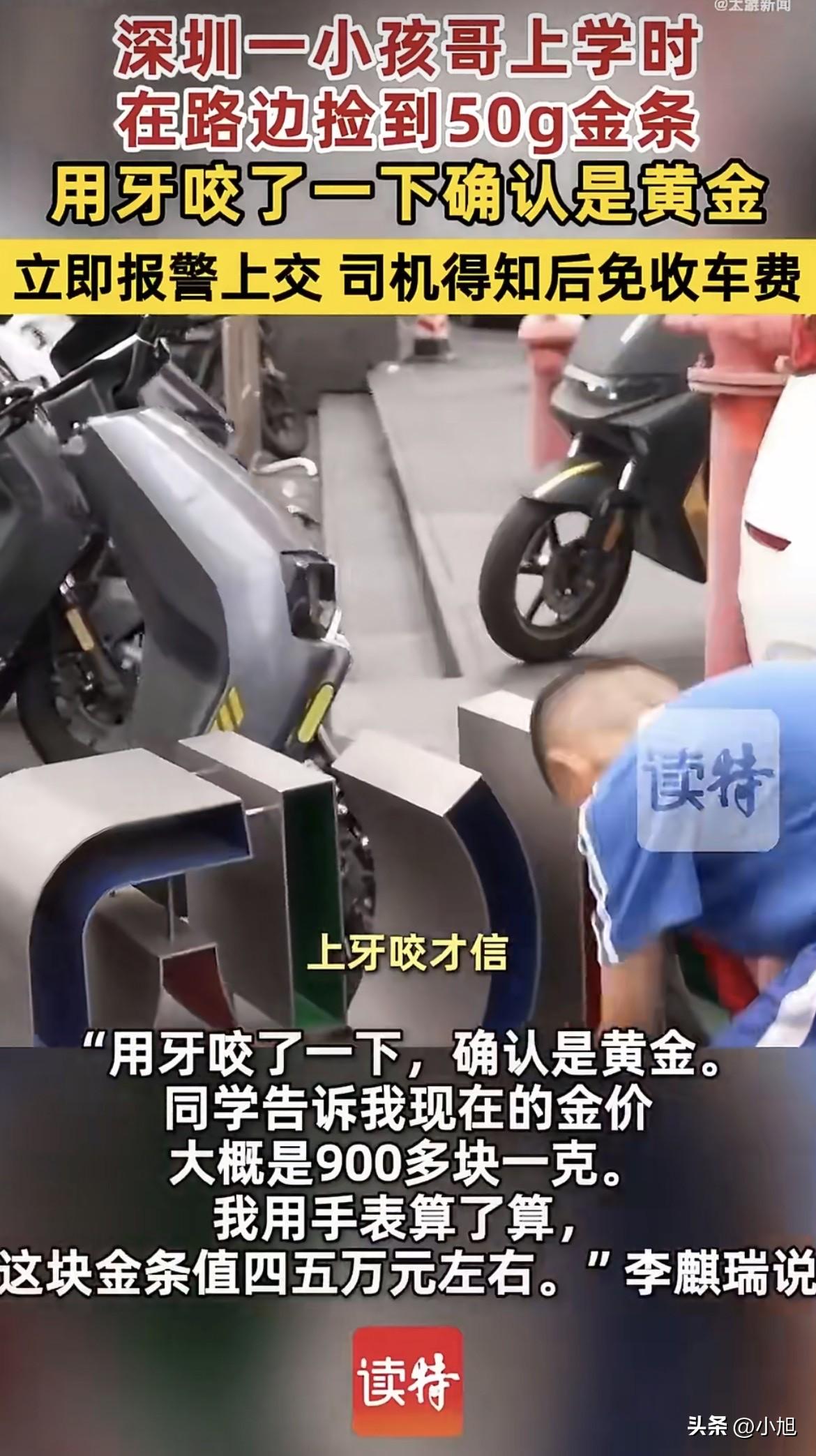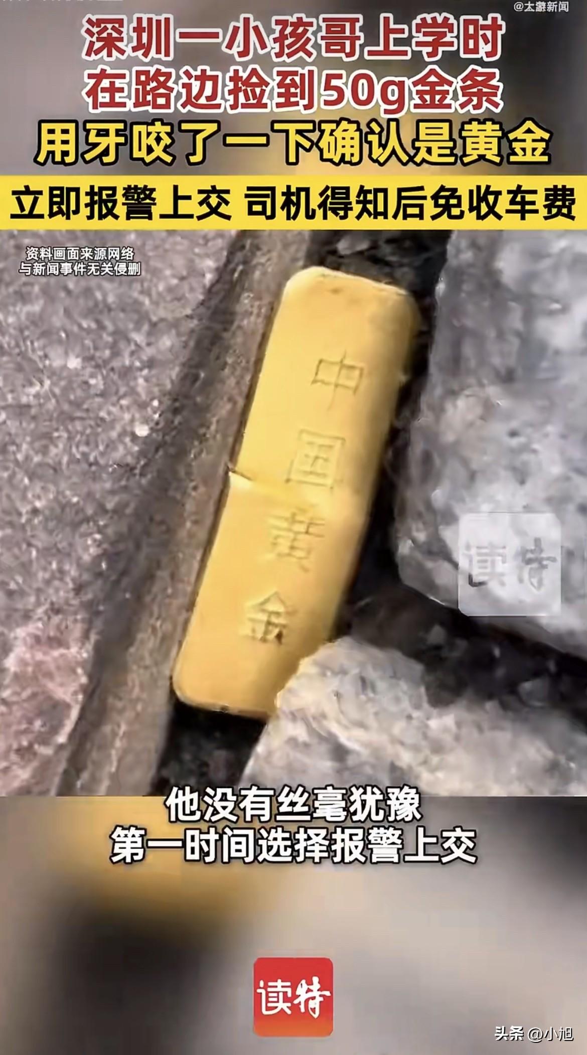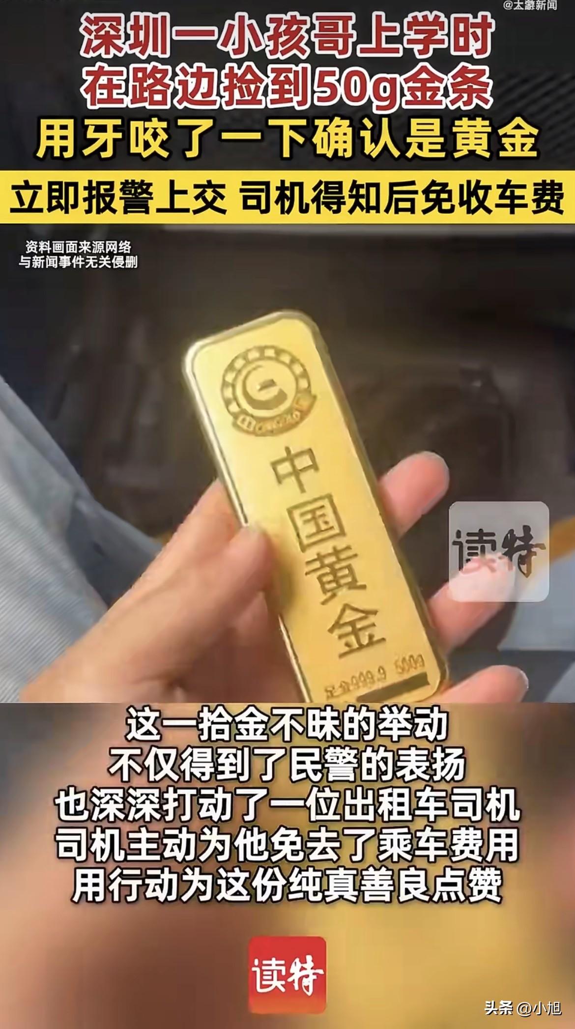 4月1号,深圳翠北实验小学门口,五年级的李麒瑞蹲在人行道上,盯着手里那个塑料袋看了足足半分钟。 他没敢动。也不敢信。 塑料袋里是一根金条,50克,上面清清楚楚印着“投资足金”四个字。这个11岁的男孩做了一件让所有大人都没想到的事——他把金条塞进嘴里,用牙咬了一口。 有牙印。是真的。 这时候他才有点慌了。正好同学路过,他把金条递过去给人看,两个孩子趴在路边小声嘀咕。同学掏出手机查金价,告诉他现在一克900多块。李麒瑞抬起电话手表,当场算了笔账:50克,差不多四五万。 四五万。这个数字对一个五年级孩子意味着什么,他心里清楚得很。 但他没犹豫。直接拨了110。 这不是他第一次这么干。之前捡到身份证、学生卡,他也是第一时间找老师、想办法联系失主。只是这次金额大了点,大了“亿”点。 电话打完,他就站在校门口等。等了二三十分钟,翠竹派出所民警到了,拍照、登记,整个过程他配合得很认真。民警当场说了一句话:“这么小的孩子能有这样的判断力和责任感,非常难得”。 李麒瑞倒是很平静,说了句:“老师和爸爸妈妈一直告诉我,不是自己的东西不能拿。” 这话听着简单,但搁在四五万块钱面前,简单就不简单了。 更有意思的事发生在3月30号。那天老师陪他去派出所说明情况,打了辆出租车。车上老师跟司机聊起这事,说这孩子捡了根金条,主动交给警察了。司机听完,一脚刹车踩下去,回头看了一眼后座的小孩。 然后他说了一句让所有人都愣住的话:车费免了。 老师掏出手机要扫码,司机一把推开。他说了一句特别朴实的话:“孩子眼里有光,我们应该鼓励。他的心里装着一颗大大的爱心,车费一定不能收。” 李麒瑞坐在后座,估计也没想到,自己一个“应该的”举动,能让一个素不相识的成年人这么感动。他后来跟人说了一句话:“原来善举是真的可以传递和感染别人的。” 这话从一个五年级孩子嘴里说出来,不是大道理,是他亲眼看见的一件事:你做了一件对的事,世界真的会给你一个回应。 这场善意的接力,其实有两个细节值得琢磨。 第一个是李麒瑞咬金条的那一口。很多人当笑话看,觉得小孩天真。但仔细想想,一个11岁的孩子,面对一根突然出现的金条,第一反应不是高兴,而是怀疑——这到底是不是真的?他用最笨的办法验证,确认是真金之后才决定报警。这说明什么?说明他心里有杆秤,知道什么东西该拿、什么东西不该拿,但在做决定之前,他得先把事情搞清楚。 第二个是出租车司机的免单。司机跟这孩子非亲非故,连名字都不知道,就听了一件事,就决定不收钱。他说“孩子眼里有光”,这句话背后是什么?是一个成年人,在这个孩子身上看到了自己可能已经丢掉的东西。他想用这种方式告诉孩子:你做得对,我支持你。 这就是善意的传递。不是靠说教,是靠行动。 还有一个细节更耐人寻味。老师后来透露,李麒瑞平时就有一个志向——参军报国,保家卫国。一个11岁的孩子,捡到金条不动心,他的志向是保家卫国。这两件事放在一起看,就不只是“拾金不昧”那么简单了。 金条现在还在派出所,等着失主去认领。李麒瑞的生活照常,每天背着书包上学放学。但那个出租车司机、那个蹲在路边用牙咬金条的小男孩、那句“不是我的东西不能拿”,在这个春天,让很多人心里动了一下。 这事的深层逻辑其实挺简单的:一个孩子做了一件他认为“应该”的事,一个大人用他认为“应该”的方式回应了。两个“应该”撞在一起,就成了新闻。 为什么这么多人转发?因为大家心里都明白,在这个时代,“应该”做的事,有时候反而成了稀罕事。一个孩子面对四五万块钱,能说出“不是我的东西不能拿”,这背后站着的是他的父母和老师——是日复一日的言传身教,才让他在关键时刻知道该怎么做。 而那个出租车司机的免单,更让人动容。他不是在表扬一个孩子,他是在用自己的方式告诉所有人:善良是值得被鼓励的,好人是有好报的。哪怕这个“好报”只是一趟免掉的车费。 黄金有价,诚信无价。少年有心,城市有光。 这句话放在深圳这座城市身上,特别贴切。深圳不是第一次发生这种事,之前也有打工人捡到百万黄金第一时间报警,外国游客丢护照三小时找回。这些事说明一个道理:当社会形成“善有善报”的正向循环,崇德向善就会成为一座城市最鲜明的标识。 你看,这世界没那么多复杂的大道理。就是一个孩子,在路上捡到一笔横财,他没动心,交给了警察。然后一个大人知道了,觉得这孩子了不起,用免单的方式给他点了个赞。 就这么简单。 但偏偏是这种简单,最让人绷不住。 如果是你,在路上捡到一根金条,会怎么做? 来源:新华社、深圳卫视、深圳晚报、极目新闻、大象新闻