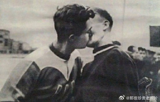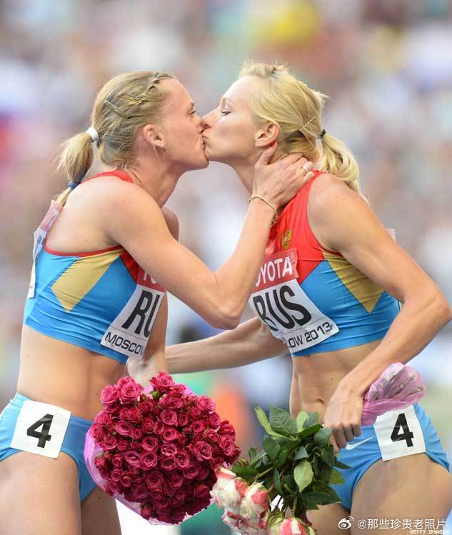 P1:1953 苏联与罗马尼亚运动员接吻P2:年代不详,苏联海报上两位妇女接吻P3:1980年莫斯科奥运会,分获金银牌的苏联游泳运动员亚历山大·西多连科和谢尔盖·费琴科赛后接吻P4:1956,莫斯科,列宁体育馆,在奥运会预选赛里,蛙泳运动员玛丽亚·加弗里什击败埃拉·科瓦连科后,二人接吻。P5-6:2013年,莫斯科,世界田径锦标赛女子4X400米赛后,获得金牌的俄罗斯运动员克谢尼娅·雷佐娃和尤利娅·古斯金娜接吻