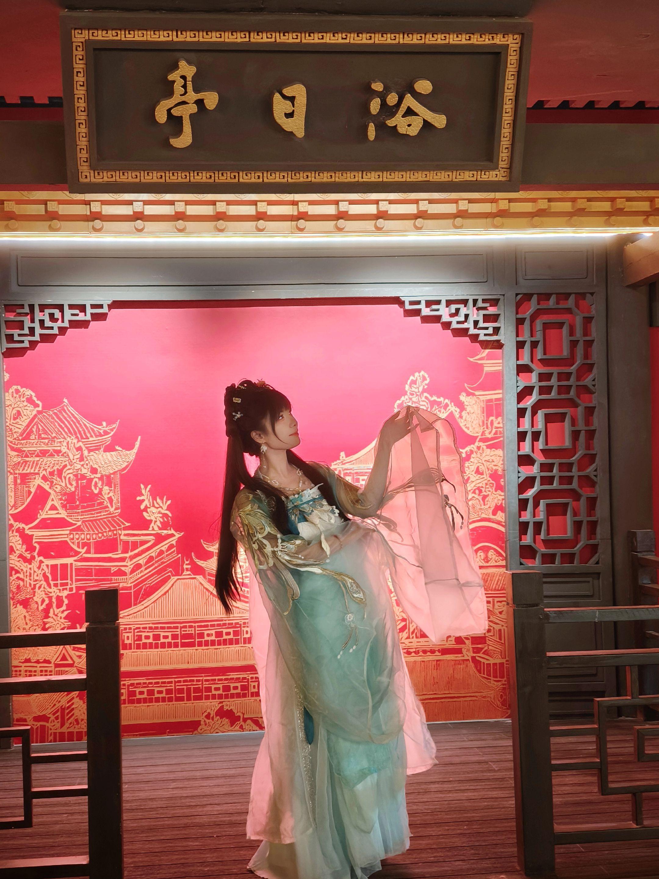 流程是这样的——到了先挑衣服,300多套随便选,我纠结了半天最后选了套清朝汉服,发朋友圈朋友叫我靓爆镜 “小青”😂。十多位化妆师现场爆改,头饰一戴,瞬间入戏✨ 然后6大场景自由拍照,黄埔古港、异域宫殿、十三行……还没开餐手机已经拍没电了📱