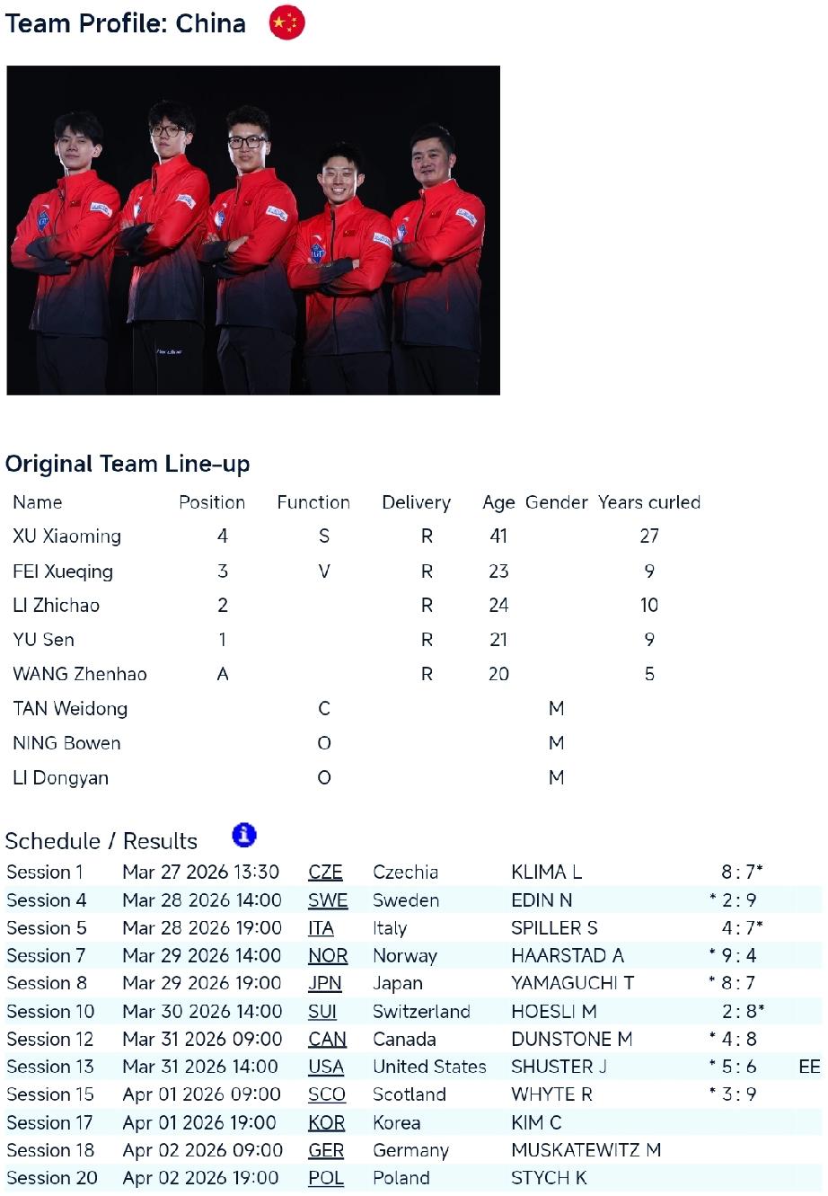 中国男子冰壶队循环赛第六败! 4月2日凌晨,在美国进行的2026年男子冰壶世锦赛循环赛比赛中,中国队迎战第九个对手、世界排名第一的卫冕冠军苏格兰队。 此前,中国队战绩是3胜5负,积分榜排名第8位。苏格兰低开高走,开赛两连败后,已经取得6连胜! 本场比赛,中国队以3-9不敌苏格兰队,中国队遭遇四连败!苏格兰队实现7连胜!中国队无缘附加赛。 今天,中国队先后迎战韩国和德国队。
