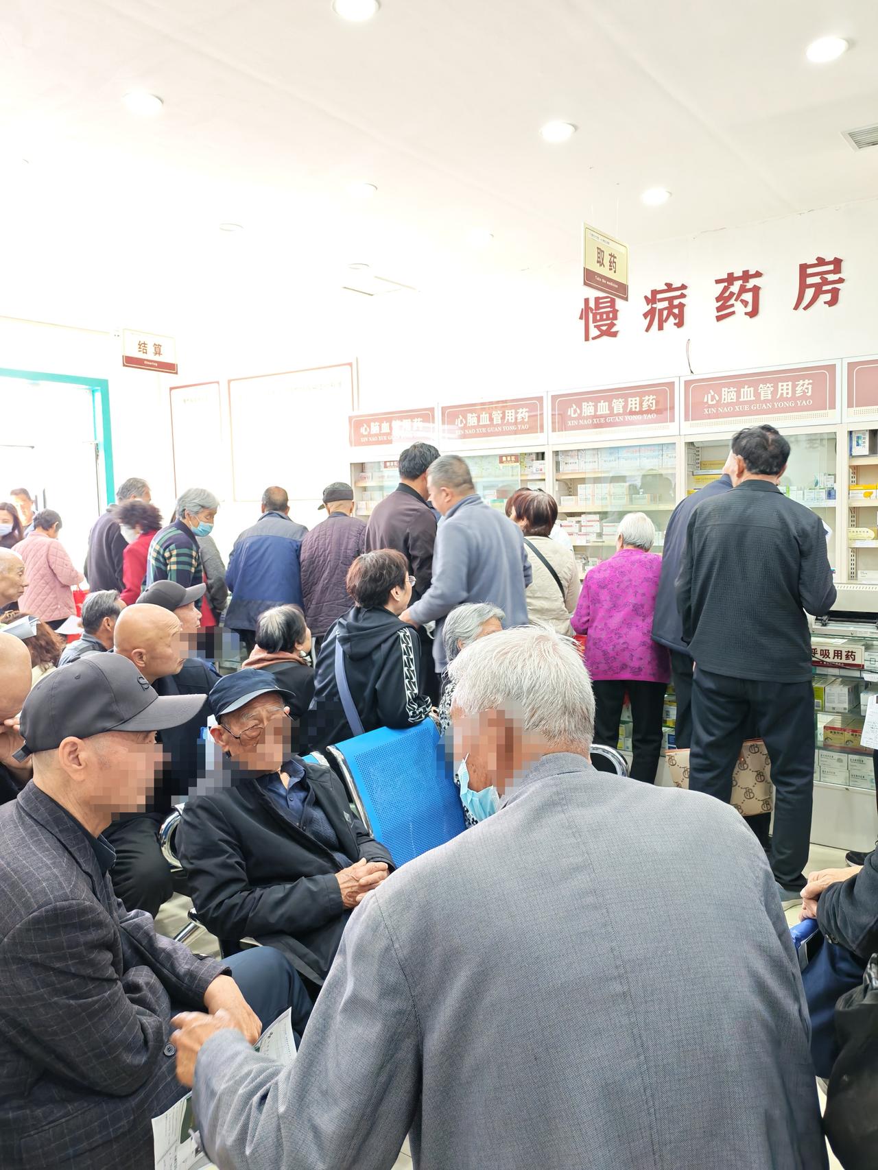 慢病药房,买药的人挤人。老龄化社会药物治疗是长寿的一个关键因素。