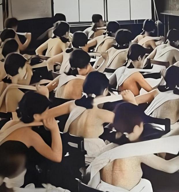 [太阳]1938年,日本国内,高中生上课一丝不挂地接受军国主义的熏陶时,留下的老照片,镜头中的他们赤身裸体,毫无羞耻感。 一张1938年的老照片,最近在网上引起了不少议论。照片拍摄于大阪的一间教室里,画面里是一群正在做“干布摩擦”训练的日本女高中生。 那时候的她们,上半身赤裸着,手里拿着粗糙的干毛巾,在身体上来回擦拭。最让人心里发毛的是,照片里的姑娘们神情平静,动作整齐划一,仿佛在做一件再平常不过的事情。 如果不了解那段历史,谁看了都会觉得匪夷所思。但这张照片背后,藏着的其实是一个国家教育体系彻底变味的残酷真相。 所谓的“干布摩擦”,原本并不是什么稀奇事。在日本民间,老百姓冬天怕冷,就用干毛巾使劲擦身子,让皮肤发热,起到暖和的作用。在学校里,这也只是偶尔出现的晨间活动。 可到了1930年代,随着日本国内军国主义风气越来越浓,这件小事的性质就全变了。它不再是简单的健身,而是被正式塞进了学校的课程表,成了磨练所谓“意志力”、增强体力的标准动作。 照片里那些女学生一丝不苟的样子,不是哪个老师的个人行为,而是当时全日本成千上万所学校都在推行的统一标准。 那时候的学校,早已不是教书育人的清净地方,整个系统都穿上了军装。地理课上教的不是风土人情,而是怎么勘察资源;音乐课不唱抒情歌谣,改练军歌;就连日常的体操,也都带着浓浓的火药味。 当时负责教育的文部大臣叫荒木贞夫,是个铁杆的军国主义者。在他和他同僚的推动下,干布摩擦这类项目被提到了前所未有的高度。 学校变成了兵营,老师变成了教官,学生们则成了等待组装的“国家零件”。不管男女,都得适应这种集体主义的纪律,个人的想法和羞耻心,都得靠边站。 这种军事化训练是有明确分工的。女生在教室里脱掉上衣做干布摩擦,男生则在操场上练习拼刺刀和使用武器。 虽然形式不同,但目的一样:把年轻人的棱角磨平,让他们无条件服从命令,随时准备为国家机器的扩张贡献力量。 到了1930年代后期,特别是太平洋战争爆发以后,这种教育更是变本加厉。那些从小在校园里接受这套训练的学生,一毕业就被送进军队或者军工厂。可以说,那会儿的课堂,就是战场的预备班。 这一系列的变化不是一天两天突然冒出来的。从明治维新开始,日本的课堂里就慢慢渗入了爱国和军事的元素,只不过到了1930年代,这种倾向达到了顶峰。 那张照片里女孩们脸上那种“毫无羞耻感”的表情,其实是长期高强度训练的结果。在那个环境里,身体属于国家,不属于自己。 女生有时候还要背着沉重的模拟装备搞体能训练,这种对身体和心理的双重压迫,在当时却被包装成了“为国奉献”的光荣。 战争结束后,日本的教育系统来了个大转弯。1945年8月之后,占领军当局下令废除所有带有军事色彩的科目,重新编写教材。 那些曾经在课堂上做过干布摩擦的女学生,有的步入中年,有的已是白发苍苍。据一些战后的调查回忆,不少人留下了难以愈合的心理创伤。 比如在明亮的灯光下裸露身体会让她们感到极度不安,平时穿衣服也总是恨不得把自己裹得严严实实。这些细微的反应,正是那个扭曲年代留下的无声控诉。 当年大力推行这一切的荒木贞夫,后来在东京审判中被追究了战争责任。法庭上详细记录了他是怎么一步步把教育变成战争工具的。 他在巢鸭监狱服了刑,1955年因为身体不好被释放,之后一直过着低调的生活。而那些留在历史档案里的老照片,就像一道道伤疤,时刻提醒着后人,教育一旦偏离了正轨,会带来多么可怕的后果。 看着这张1938年的照片,很难不让人感慨万千。照片里的那些女孩子,如今大多已经不在人世,或者已是百岁老人。 她们那一代人,从十几岁起就被时代的洪流裹挟着,身不由己地卷入了一场巨大的灾难。一块小小的干毛巾,折射出的是整个国家机器对个体的碾压。 荒木贞夫从一个陆军大将转任文部大臣,利用手中的权力改造教育,这不仅仅是他个人的选择,更是当时日本政治环境的一个缩影。 好在历史终究是向前走的。战后的日本废除了军国主义教育,重新建立了和平的校园。 虽然那些经历过那个年代的人心里可能永远有一道坎,但至少后来的孩子们,不用再在教室里脱掉上衣,为了战争去擦拭自己的身体。 这张老照片的存在,不是为了猎奇,而是为了让活着的人记住:任何时候,教育都应该回归人性,而不是成为制造战争机器的流水线。只有这样,那些年轻女孩曾经的沉默,才不至于白费。