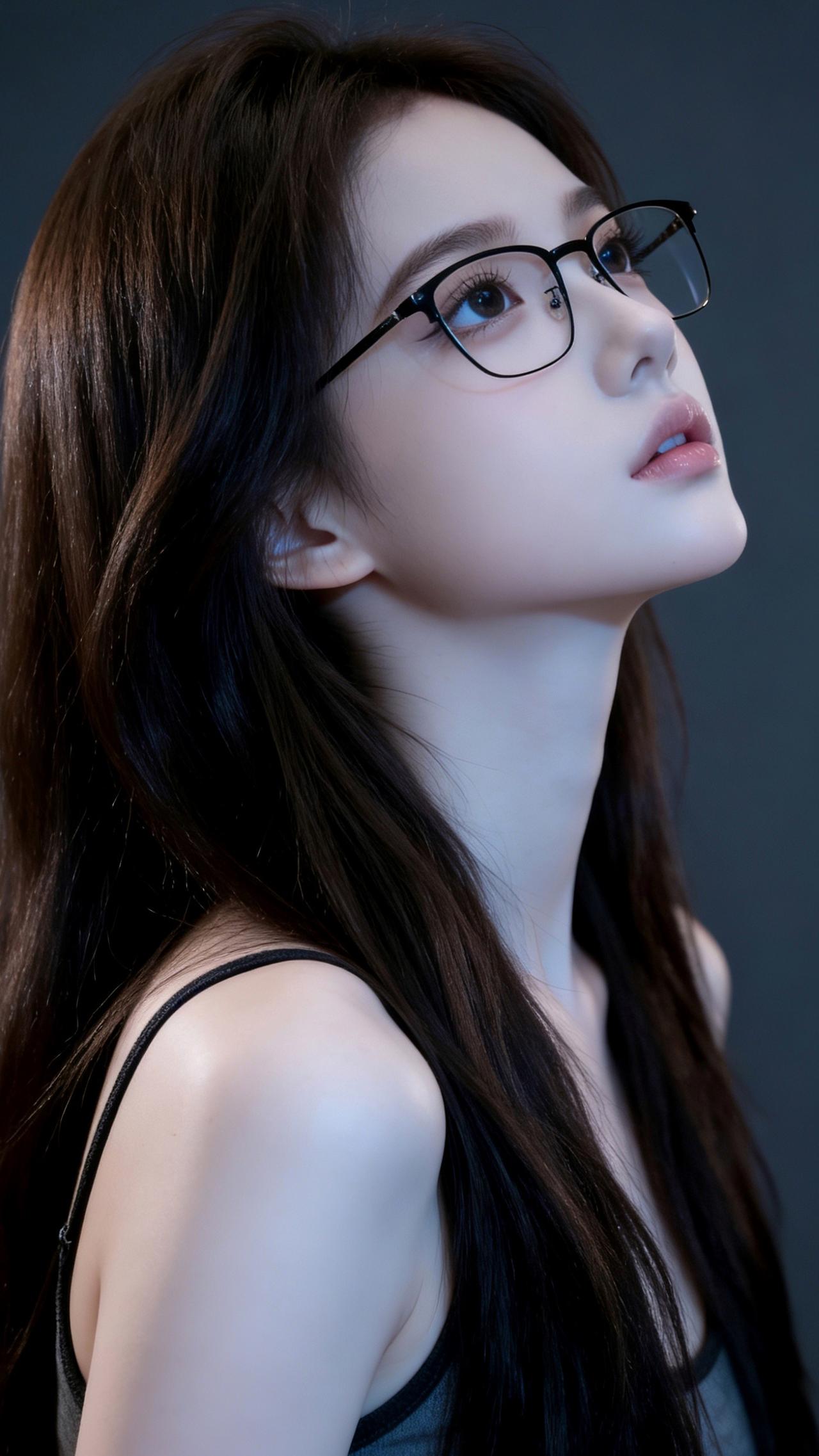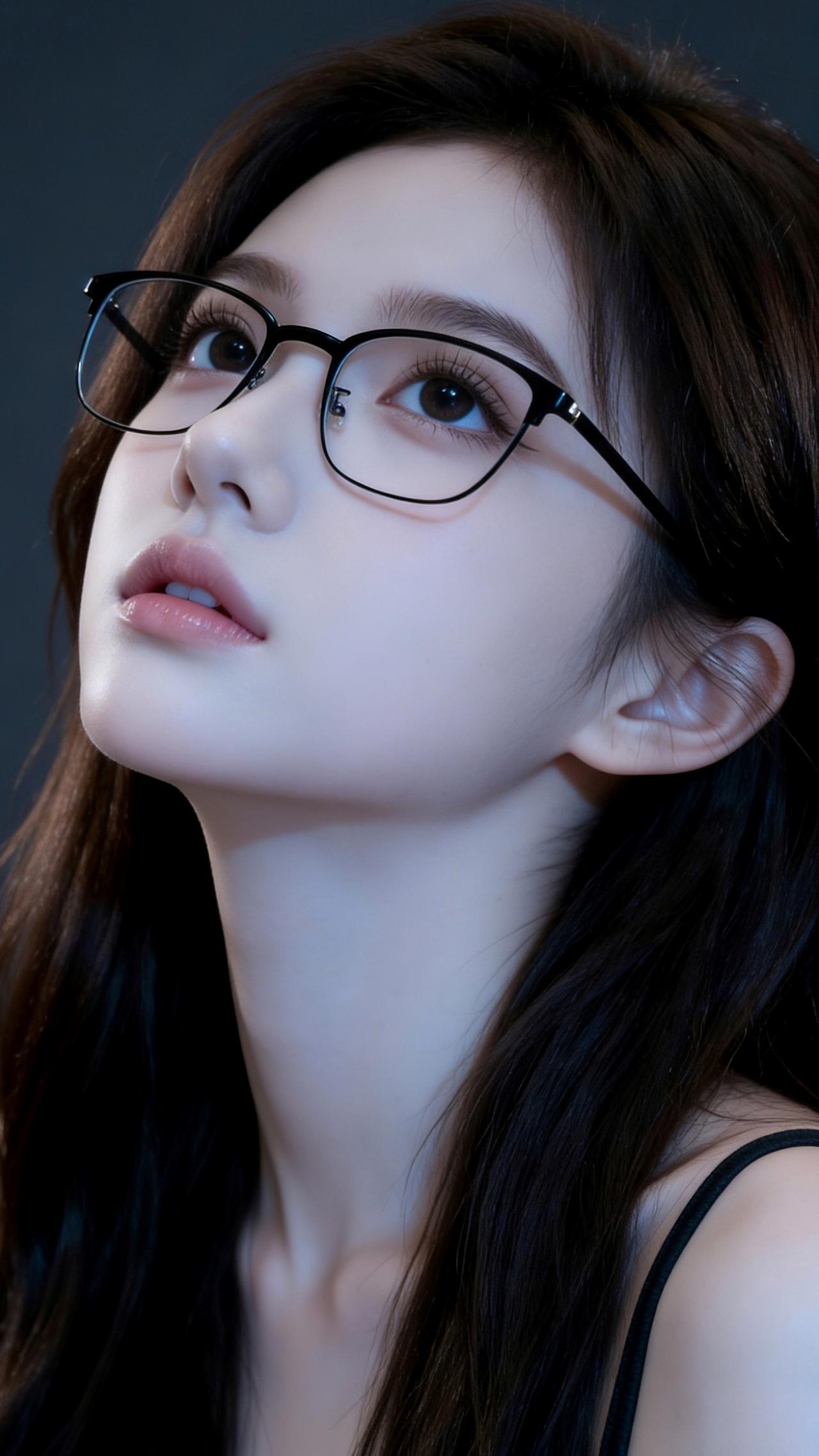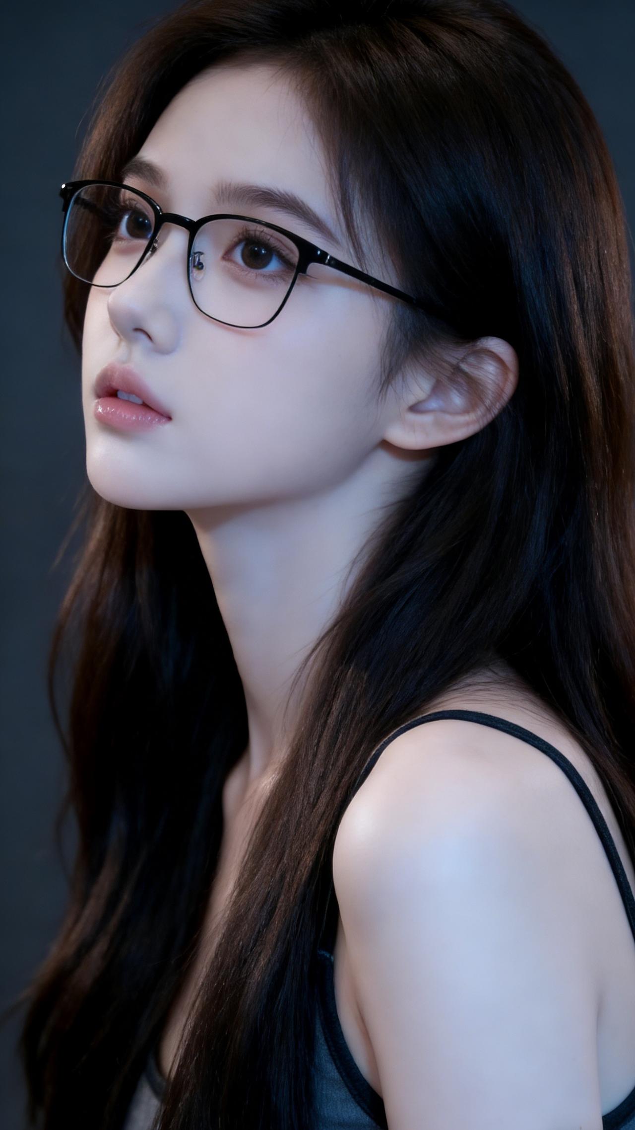九帧同绘知性侧颜仙!乌发如瀑垂落泛柔光,黑框眼镜添书卷气,黑/灰吊带衬雪肌肩颈。