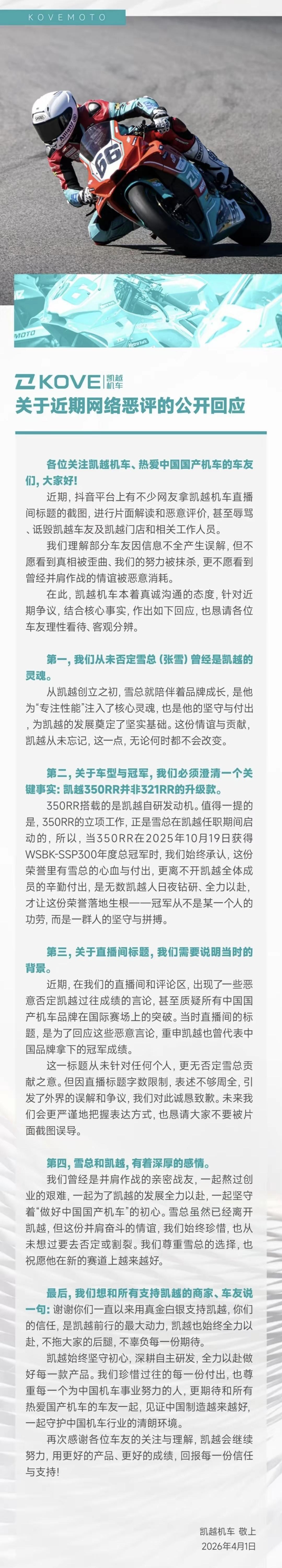 在你来之前,我们就已经是冠军了!重庆张雪机车的两次夺冠近来引发了大家的热烈讨论,质优价廉的中国制造登上了国际舞台。 然而竞争对手也是张雪曾经工作过的公司凯越车机那句“你来之前我们就是冠军了”,在营销上是典型的负分操作。这种做法既显得小气、又得罪老用户、还丢了“国货之光”的大义,完全是赢了口舌,输了口碑。这不,他们出来道歉了。 其实,有很多文案都比他这个强多了,比如下边获得高赞的这个: 恭喜张雪!中国摩托,两代冠军,同袍同光! 从凯越350RR(SSP300)到张雪820RR(SSP),中国力量登顶世界! 或者这个: 祝贺张雪机车夺冠。因为你的存在,让凯越也曾经同样骄傲过。(凯越摩托xx年夺得xx冠军) 张雪这人是个狠人,出生于湖南湘西怀化农村,初中文化,无依无靠完全没背景。也许正是因为他一无所有,才无所顾忌,一生执着于自己热爱的事情,最终换来硕果。 我们普通人其实每个人都有自己热爱的事物,但是因为条件比他好,有学历文凭有依靠加上爱体面,反而顾虑太多畏手畏脚,最后也就普通职场人“做牛做马”。