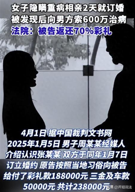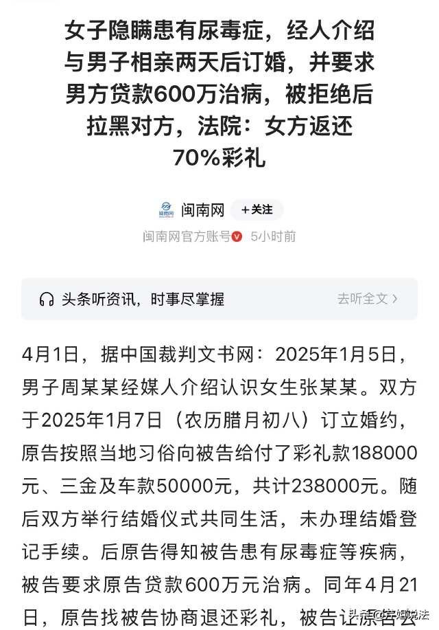 河南,一女子患有尿毒症,想找个男子接盘给自己治病。托人介绍了一个男子,认识两天之后女子就匆匆要求订婚,男方给付了彩礼钱18.8万元、三金及购车款5万元,合计23.8万元,之后二人就举办婚礼、共同生活,但是没有登记结婚手续。没多久,女子露出真面目,说自己患有疾病,要求男子借款600万元给自己看病。男子震惊不已,想要跟女子好聚好散,没想到女子直接拒绝,并且将男子拉黑。 闽南网4月1日报道了这则新闻。 患病了确实可怜,但是别人没有义务来给你看病啊,而且主观上就具备了恶意想要故意骗婚,要绑牢男方的一辈子,这个女的想法挺“恶”的。 一女子张某,身患疾病,如果要安稳地活下去,那就需要巨额的医疗费用。 想到自己经济能力淡薄,女子心想,可以找个男子结婚,作为自己的老公,他必须要对自己的下半辈子负责。 张某赶紧找了个介绍人,托她帮忙介绍个对象。正好男子周某也在找女朋友,两个人就这样认识了。 相亲的时候,张某并没有如实告知自己的情况,同时还隐瞒了自己患有疾病的情况。 认识后两天,张某就跟男子周某匆匆订婚了,商定了婚事的相关事宜,包括给付彩礼钱这些。 女方家里提出:必须要给彩礼,就要看男方的心意了。 男方家也是给出了满满了的诚意:彩礼款18.8万元;三金以及车款费用5万元。合计23.8万元。 彩礼钱交付完毕之后,双方就举行了结婚仪式,但是并没有办理结婚登记手续。 结婚之后,两个人就开始了正式的同居生活,谁知道,相处了一段时间之后,张某病情反复,正式到了需要治疗的周期。 张某发现事情兜不住了,也赶紧将自己的病情告诉给了周某。 对于自己的谎言,张某没有一丝愧疚,甚至还理所当然地提出:你得给我治疗,我这个病需要长期、稳定的医疗费用,你最好借钱500万给我备着,留着我治病。 听完之后,周某内心震惊得不行,一整个惊呆了,眼前这个张某,此举完全就是骗婚吧。 气愤至极的周某,考虑到好聚好散,就准备跟张某协商了和平离婚,其实就是分手,毕竟也没有领证。 周某的意思是,让张某退还全部的彩礼钱。 谁知道,如今的张某正是要钱的时候,她可不肯退还一分钱,直接就拒绝了周某,还表示,让周某去上诉,总之,还钱绝对是不可能的事情。 之后,张某就把周某给拉黑删除了。 随后第二天,张某也就陷入了昏迷,被家人送去了医院治疗。而周某则一直试图跟张某联系,奈何一直没法联系上。 当张某这一段周期治疗出院后,周某则继续联系张某,但是张某一直拒绝答复,并且拒绝见面。 无奈,周某只能一纸诉状,将张某给上诉了。 经过判定,最后审定结果也出来了。相关部门判定,张某需要返还给周某166600元,驳回了其他诉请。 根据《民典法》规定,男女缔结婚姻,一方隐瞒重大疾病,存在重大过错,另一方可以支持离婚、可以提出返还彩礼诉求。 本案件陷入退还彩礼纠纷,张某跟周某没有领证,但是举办婚礼,之后共同生活大概3个月,同居的时间比较短,所以倾向于较高返还比例。 为什么男子无法得到全部额度的返还款呢? 因为已经共同居住了一小段时间,彩礼也可能有所消耗,最后判定返还70%,已经体现了男方被骗的保护,但是也没有完全剥夺女方的基本权益,已经做到了较为公平。 根据《民典法》规定,夫妻之间负有互相抚养义务。 这条法令的前提是,合法夫妻,并且是结婚之后,一方患病,另外一方具备扶养的义务。但是对于周某来说,他完全没有法定义务去扶养张某。 结婚之前,张某故意隐瞒重大疾病,基于此,周末就可以主张判定离婚,未领证者可以判定返还彩礼,诉求均可以获得支持。 而且张某的意图很明显,就是单方面的索取,超出了合理情感支持范畴,本来二人就没有领证,没有夫妻间的法定抚养义务,所以周某就没有强制救助的责任。 这场风波,折现了很多婚恋态度,有人似乎把婚姻当成了一种义务或者交易。 对于男方周某来说,其实保护好自己,及时撤离,也不是自私,更多的是对家庭还有未来的责任。 对于张某的做法,是否正确呢?您怎么看呢?