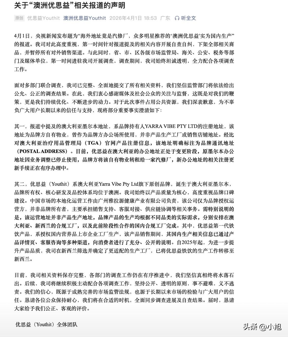 4月1号这天,央视的记者去了趟澳大利亚墨尔本,按着优思益产品包装上的地址找过去。 丁格利湖路28号,大门倒是开着,可里头工人们正趴在地上修汽车,地上全是机油和扳手,哪有什么保健品工厂的影子。 消息传回国内,最先坐不住的是那些刚买完产品的消费者。有人马上翻出购物记录,扫了扫补铁剂包装上的溯源二维码,企业名称翻译过来是“仙乐健康科技(安徽)有限公司”。 安徽马鞍山。 这人当场就懵了,赶紧截图找平台客服核实。客服倒是回得快:“是澳大利亚的品牌,但是是在国内生产的。” 这话听着就绕。品牌是澳洲的,东西是国内的,那消费者花的钱到底买了个什么? 优思益的反应快得让人意外。抖音、天猫的海外旗舰店,说关就关,页面直接灰掉。小红书账号也被禁了言,置顶写着“违反社区规则”。 动作这么快,反倒让人更想弄明白到底怎么回事。 紧接着,国内这边动静大了去了。省市区市场监管局、海关、公安、税务,全来了,直接进驻广州雅拉源健康产业有限公司——优思益在中国的运营商。 办公室里的工作人员被问得有点慌。记者问叶黄素胶囊哪产的,一开始还挺硬气:“澳大利亚生产的。”补铁口服液呢?“新西兰的。” 可记者提到有消费者查到安徽那家工厂,工作人员立马改了口:“我们以前的补铁剂是国内生产的,2025年做升级的时候换了供应商。” 记者追问现在到底在哪生产,对方直接不说了:“我们不会提供工厂信息的。” 这话说得很明白,消费者想知道自己吃的东西到底产自哪里,门儿都没有。 真正的内幕,是背后的营销公司自己漏了底。 央视记者找到了杭州索象营销策划有限公司——负责优思益营销的团队。负责人卢总说得那叫一个直白: “我们做的‘优思益’,说白了这是广州的一家公司,产品也是广州的,只是我们把它包装成了澳洲的。” 卢总还透露了更多操作细节。在澳洲找当地的大学教授、医学博士做“背书”——这些都是要花钱的。没有这些背书,消费者不敢吃,产品卖不动。 还有那个宣传页上的“国际大奖”奖杯。卢总说得轻描淡写:“这些奖都是我们给他申请包装的,全球的奖我们都有资源,一个奖大概2、3万块钱。” 把一个普通产品包装成“澳洲进口”,前期投入要几百万。而这些钱,最后都得从消费者身上赚回来。 有消费者算了笔账。一瓶蓝莓叶黄素胶囊卖293元,一瓶黑曜石叶黄素护眼片卖434元。这价格比国产的高出好几倍。可钱花出去,买的可能还是同一家工厂出的东西。 事情越闹越大,国务院食安办、市场监管总局、海关总署都发了话,要严查。广东那边,市场监管、海关、公安三部门联合进驻雅拉源公司。杭州这边,滨江区市监局也去索象公司调查取证。 这时候,有人翻出了与辉同行的带货记录。 第三方数据显示,与辉同行直播间曾为优思益创造1000万到2500万元的销售额,卖出了7.5万到10万单。至少有7万多消费者是冲着“董宇辉”的招牌买的。 有媒体记者去问与辉同行客服,对方回了句:“您反馈的问题我们已经收到,我们会重点关注,感谢您的关注。” 这话听着客气,但什么都没说。 优思益的声明倒是发了,洋洋洒洒写了不少。说那个汽修厂的地址以前确实是他们办公室,现在搬家了,转租给了汽修厂。还说第一代铁饮产品确实在国内生产过,但详情页都写清楚了。 可消费者不买账。有人晒出和客服的聊天记录,问产品到底哪产的,客服支支吾吾,最后只说了句“以官方公告为准”。 还有人发现,优思益的产品包装上压根没有“蓝帽子”标识。那是国家批准的保健食品标志,没有这个,就是普通食品,却打着护眼的功效在卖。 广州市海珠区市场监管局已经立案调查。调查人员发现涉事企业的平台店铺涉嫌发布违法广告等情况。 有消费者在评论区留言:“我1月份刚买的,还剩大半瓶,现在不知道是该吃还是该扔。” 这句话问出了很多人心里的那点不踏实。花几百块钱买一瓶“进口”保健品,最后发现可能连生产地在哪都搞不清楚。那些明星代言、国际大奖、大学教授背书,原来都是花钱买来的。 看到这里,你会不会也去翻翻家里的保健品,看看包装上的地址到底是个什么地方? (信息来源:央视新闻、中国消费者报、南方都市报、DoNews等多家媒体2026年4月1日报道)