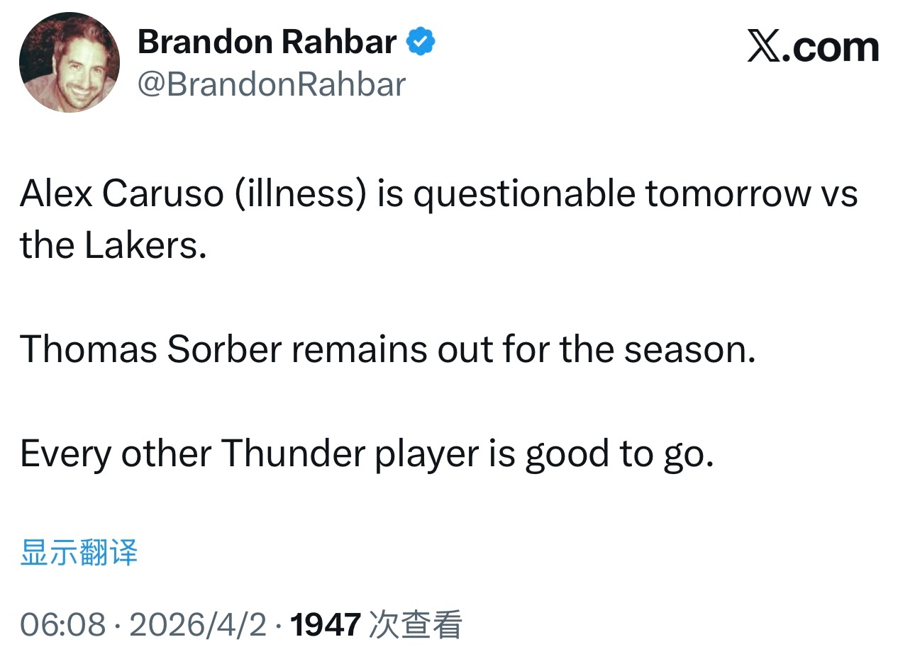 卡鲁索生病,明天出战成疑,缺席前天对阵活塞的杰伦·威廉姆斯复出,雷霆基本上是全员出战湖人。