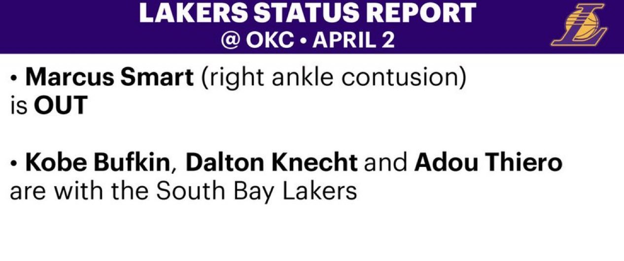 湖人出发俄城,斯玛特(右脚踝挫伤)依然无法出战!克内克特、巴夫金、蒂耶罗随南湾湖