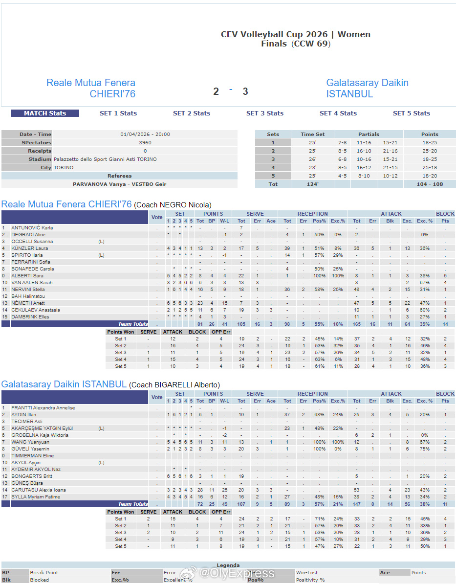 【女排欧联杯决赛I加拉塔萨雷3-2险胜基耶里 王媛媛11分】国际排坛战报速递中国排球留洋动态 4月1日都灵,女排欧联杯决赛首回合,土耳其加拉塔萨雷客场鏖战五局并且在决胜局挽救了四个赛点,以3-2(25-18/20-25/25-18/18-25/20-18)力克意大利基耶里,在两回合比赛中先声夺人。MVP卡鲁塔苏28分、希拉16分、王媛媛11分(12扣8中1发2拦),内梅斯23分、内尔维尼16分、昆兹勒13分、塞库拉耶夫11分。