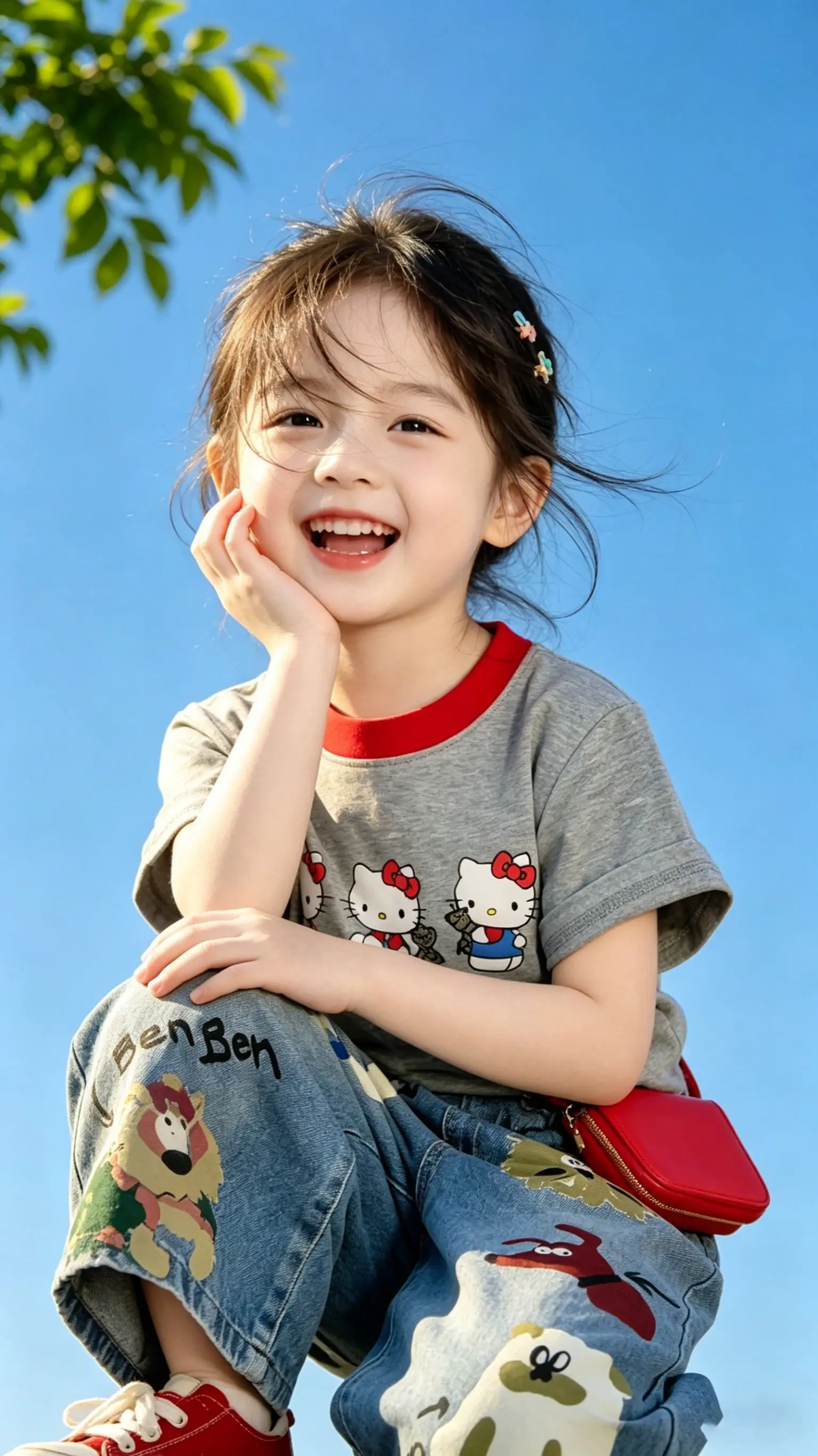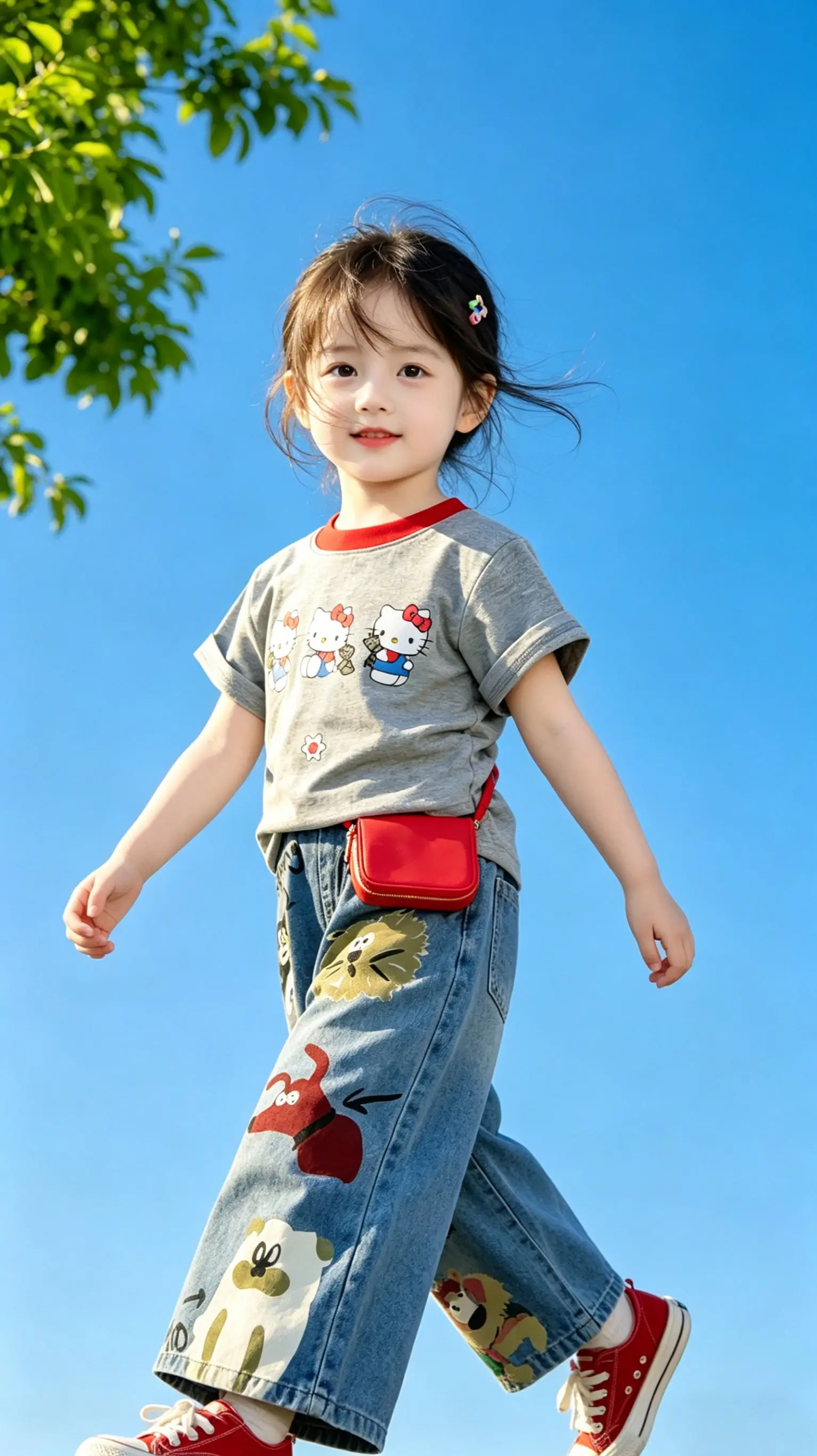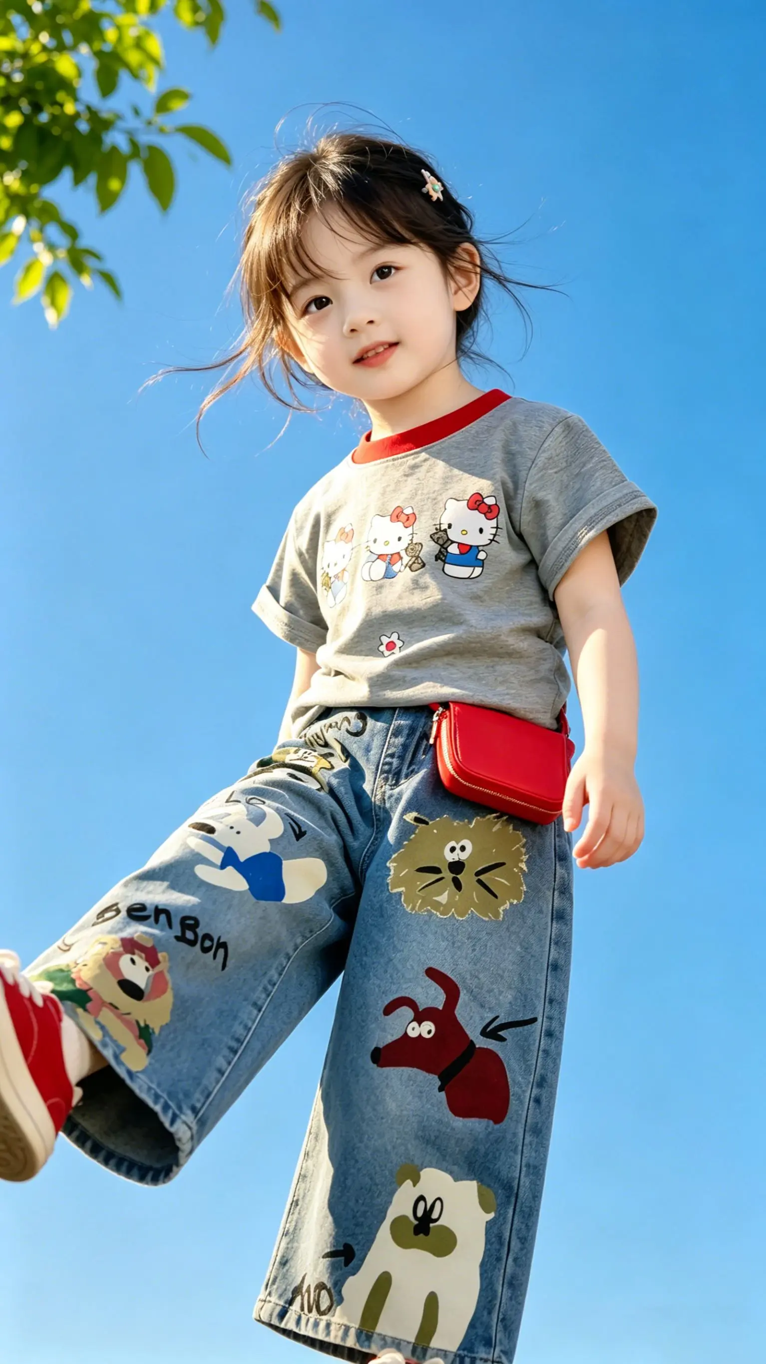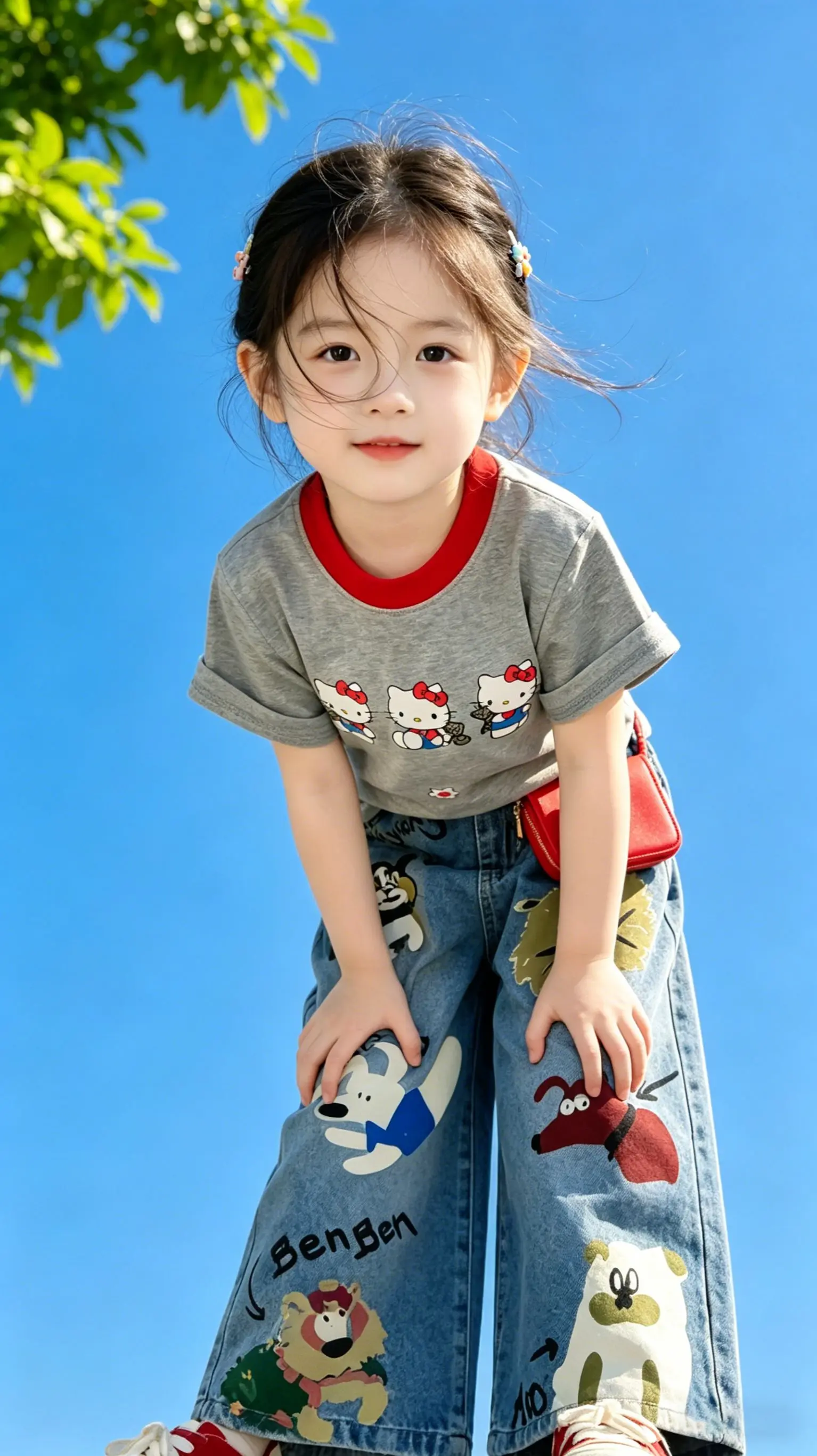 甜妹夏日穿搭公式~谁懂啊!给女儿穿这套出门,回头率直接拉满✨ 灰T+卡通牛仔裤也太减龄了吧,软fufu的Kitty和小狗印花,完全长在审美上!