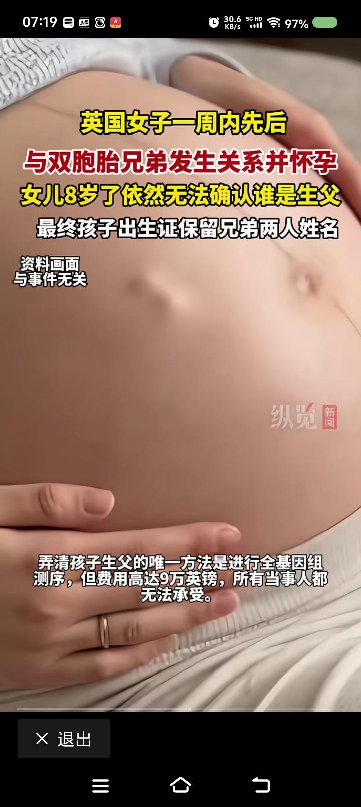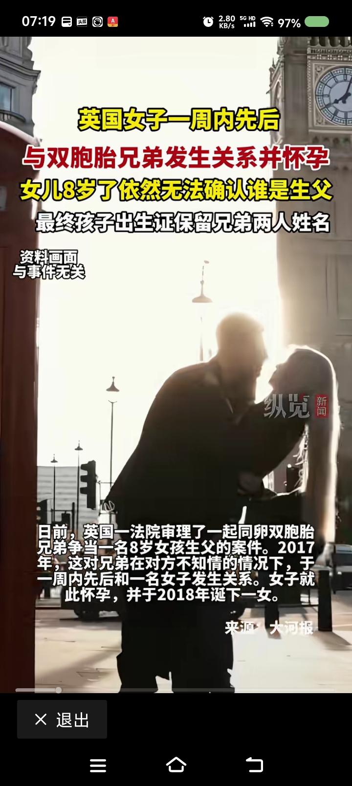 双胞胎争当一个孩子的爹?—— 据报道,英国一对双胞胎一周内先后与同一个女子发生关系。女子怀孕。孩子已8岁。常用的DNA技术无法确定孩子生父,其它手段费用昂贵。 二人争生父权。法官裁定孩子名字带两人的名字。 点评: 到底是老牌资本主义,玩得挺花。有时候,我觉得自己有病,无法理解很多事情了。 是不是宇宙是蛛蛛网,人类文明是网上一小段丝?