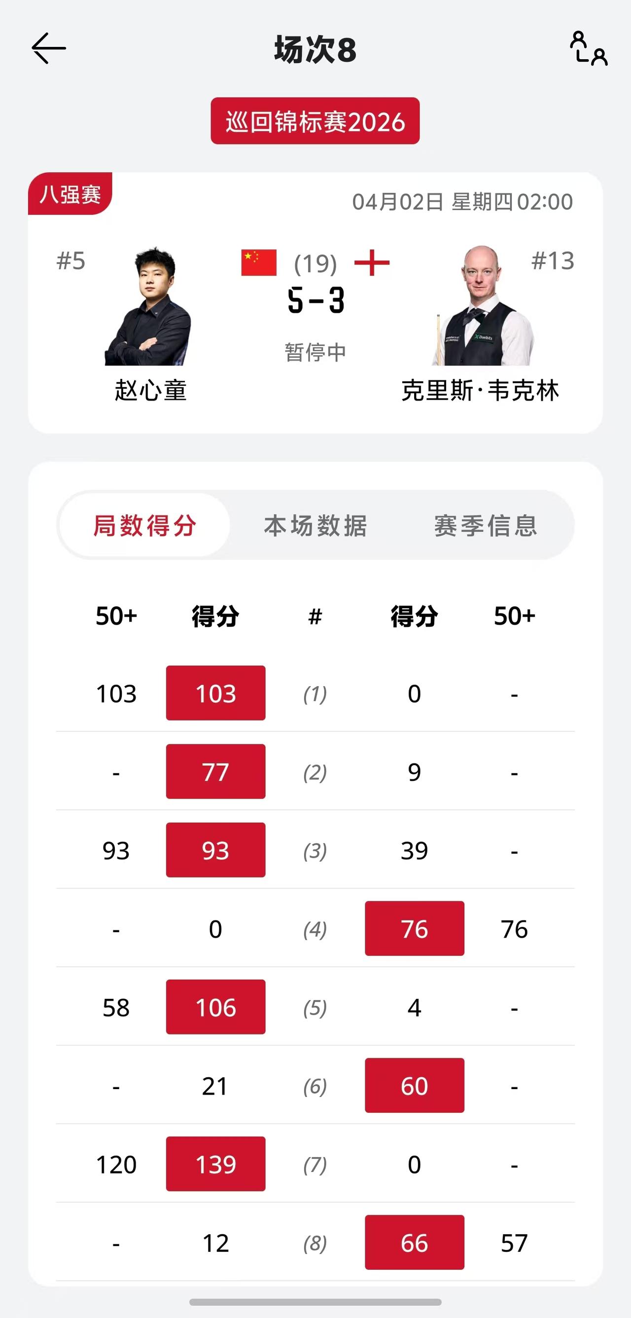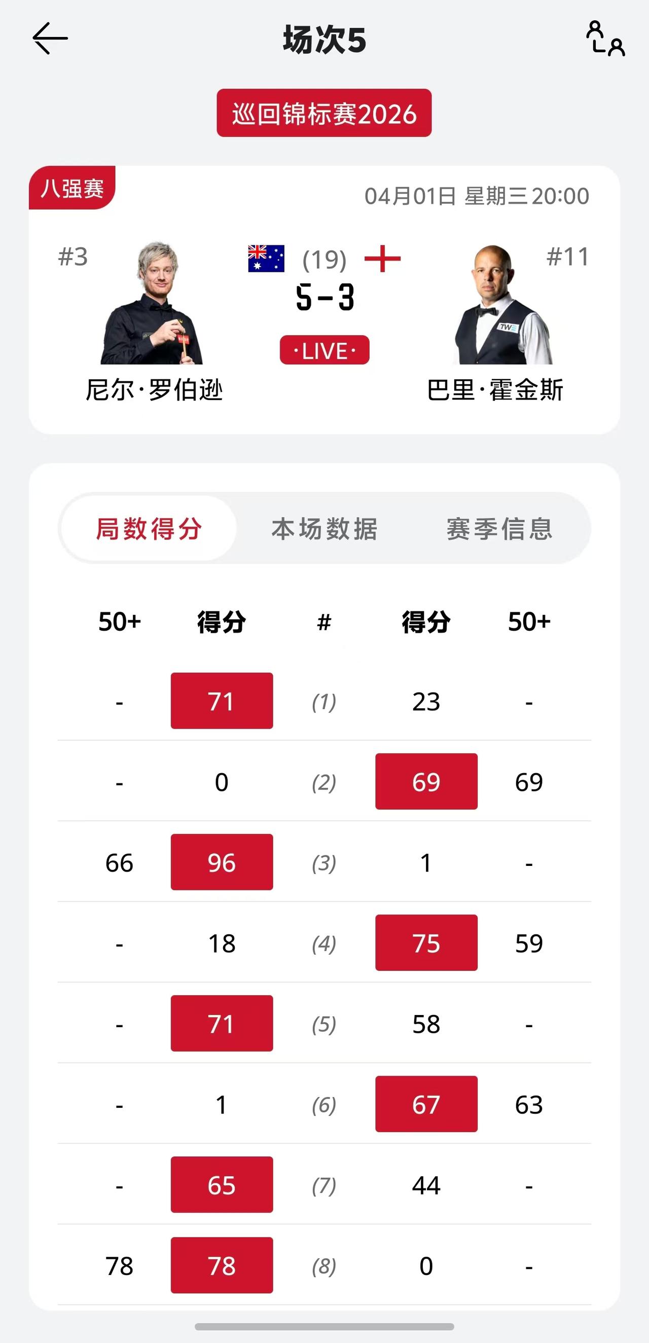 特鲁姆普本赛季第9次进入决胜局,终于全身而退,10-9拿下墨菲。 特鲁姆普最后一局相当紧张,手心出汗,好几次都觉得成功会远去,墨菲运气也稍差,红球没打进,留在袋口。 特鲁姆普说,如果这一次决胜局再次输掉,回到酒店将会非常痛苦。 墨菲说,特鲁姆普成为世界第一,绝非侥幸。 特鲁姆普在最近和墨菲的交锋中,11次赢了10次,可以说是手拿把掐。 赵心童对阵韦克林,一度4-1领先,最后打成5-3,明天凌晨2点,打第二阶段,还有悬念。 罗伯逊和霍金斯,也是5-3,今天晚上8点继续。同时开始的,还有塞尔比对阵希金斯。