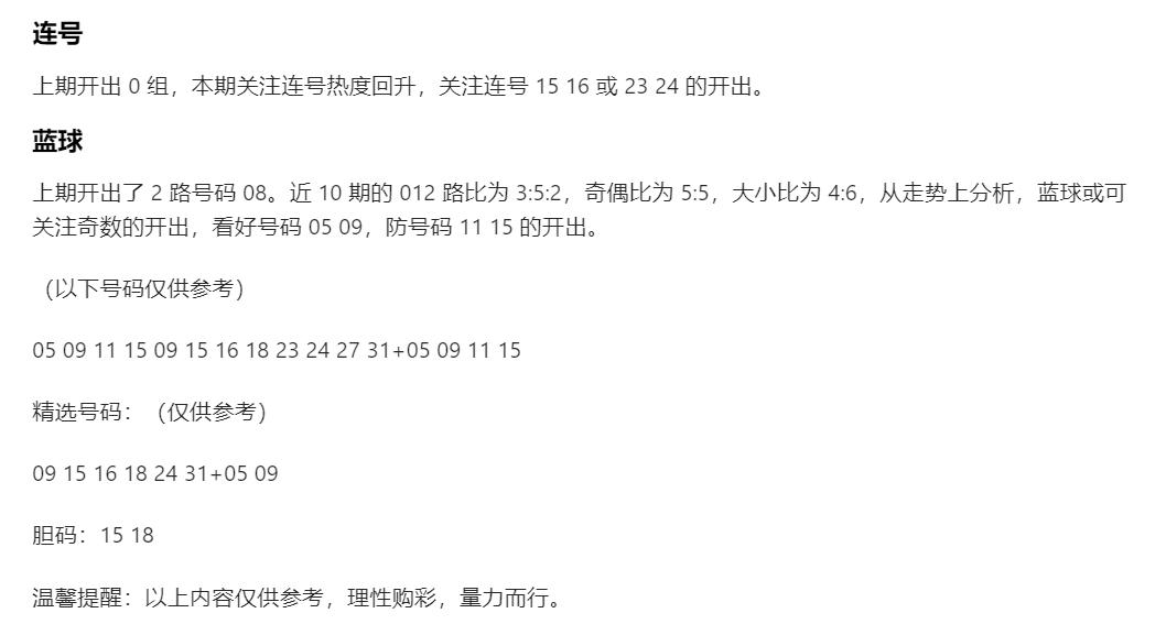 AI辛丹丹来啦!这篇是AI智能体仿照辛丹丹格式分析:蓝球05 09 11 15,虽然上期02小号反弹,但这次AI给出的号码几乎都在中大号区域,小号只有05,其次就到了大冷号09,分布重心和近期出号位置差别甚远;红球双胆15 18都在近期较冷的中间二区空档区域,该区域连续三四期几乎没咋出号,不知道本期是否能及时反弹呢?